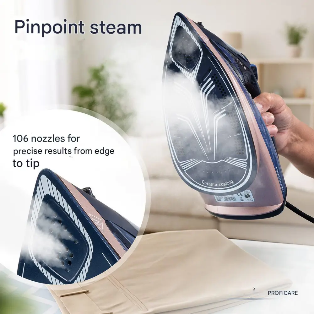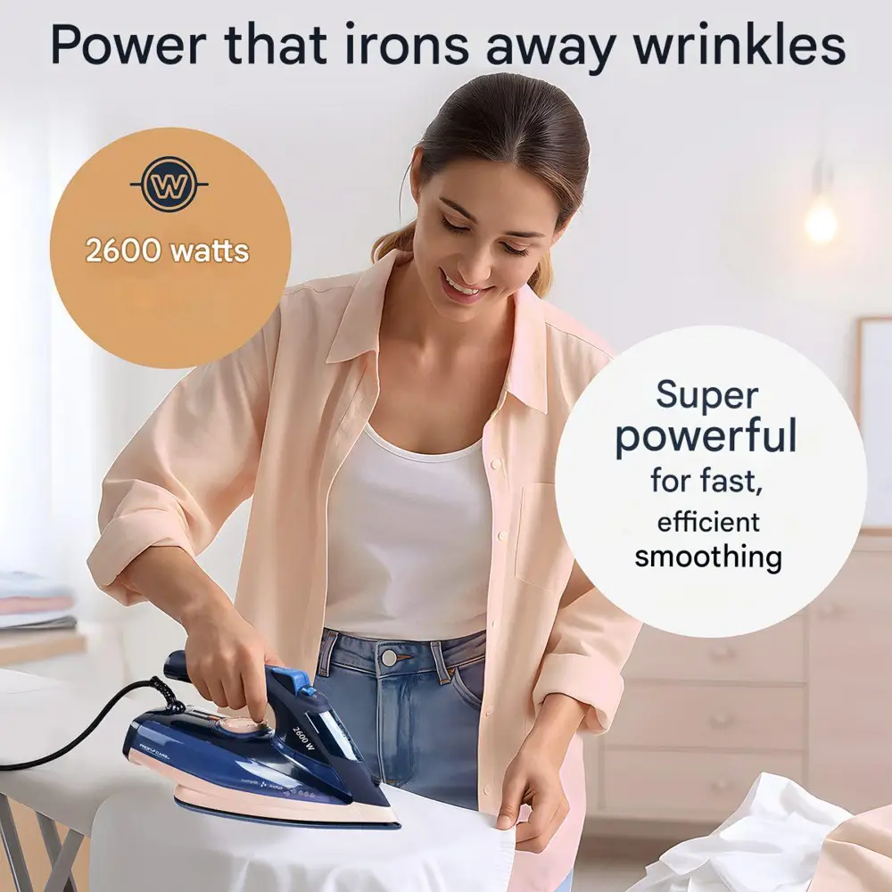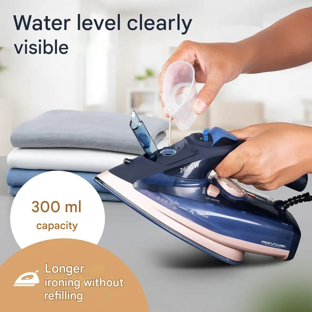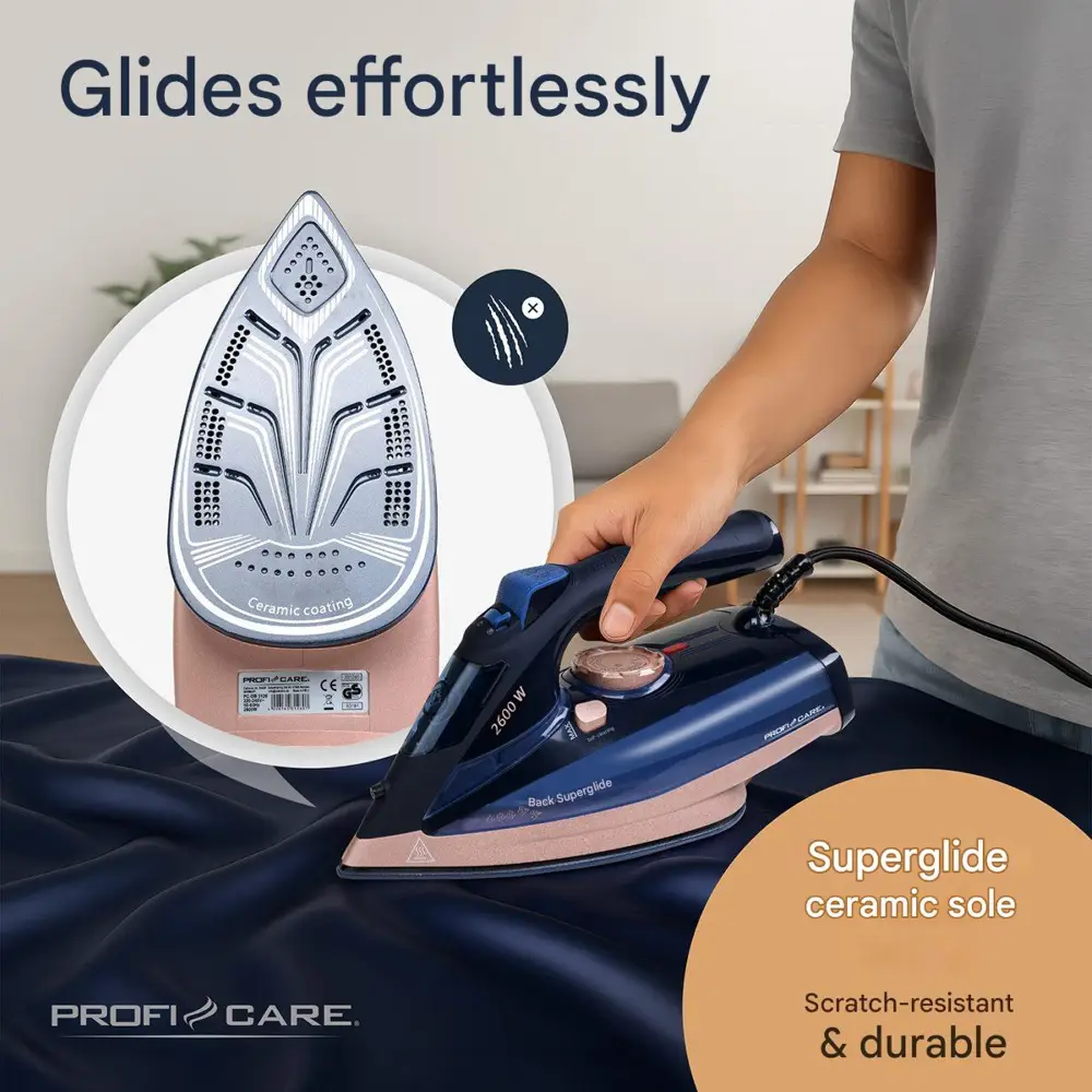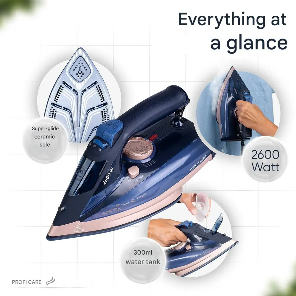 Fierul de calcat cu aburi de la ProfiCare este un dispozitiv puternic, gandit pentru a optimiza timpul petrecut calcand haine. Cu o putere de 2600 W, aparatul dispune de un timp rapid de incalzire, dar si de o incalzire uniforma ce netezeste cutele in secunde. Stratul ceramic de pe talpa usureaza calcarea hainelor, indiferent de materialul lor.
