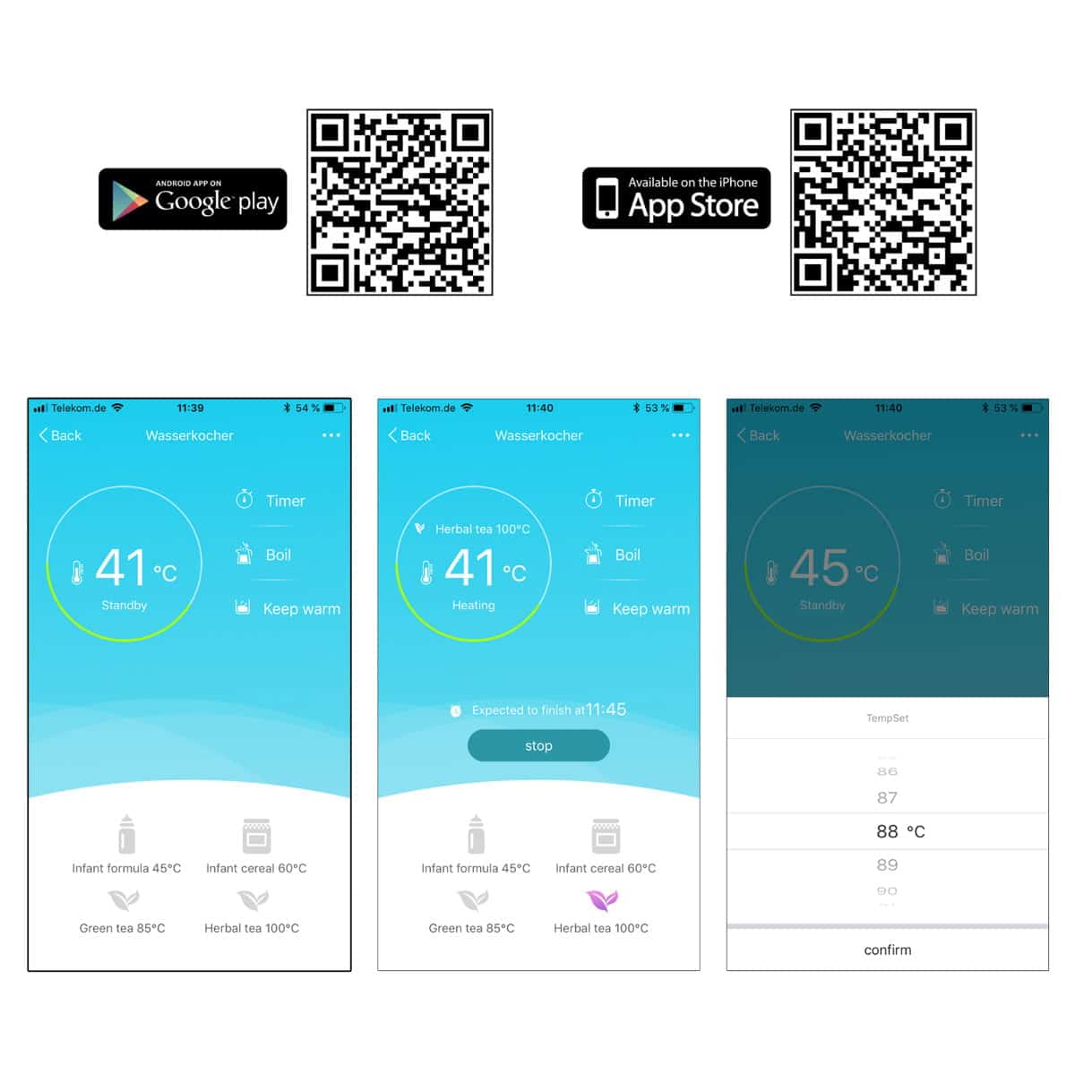 Cu functia suplimentara prin descarcarea gratuita a propriei aplicatii, puteti utiliza dispozitivul intr-un mod inedit. De exemplu, puteti utiliza smartphone-ul in mod convenabil prin Wi-Fi de acasa sau in deplasare prin Internet. Caracteristicile aplicatiei gratuite: afisarea temperaturii in timp real, functia temporizatorului, afisarea sfarsitului timpului de gatit / timpul ramas, programele de preparare a ceaiului, temperaturile pot fi setate individual si precis la grad, mentineti functia calda.