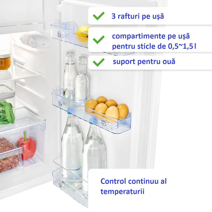 Frigiderul dispune de o capacitate totala de 99 litri, dintre care 8 litri pentru congelator, ceea ce-l face ideal pentru o bucatarie mai mica, birou sau chiar rulota. Interiorul permite depozitarea alimentelor cat mai practic, usa avand 3 compartimente potrivite pentru depozitarea sticlelor de apa, lapte si un suport pentru oua.