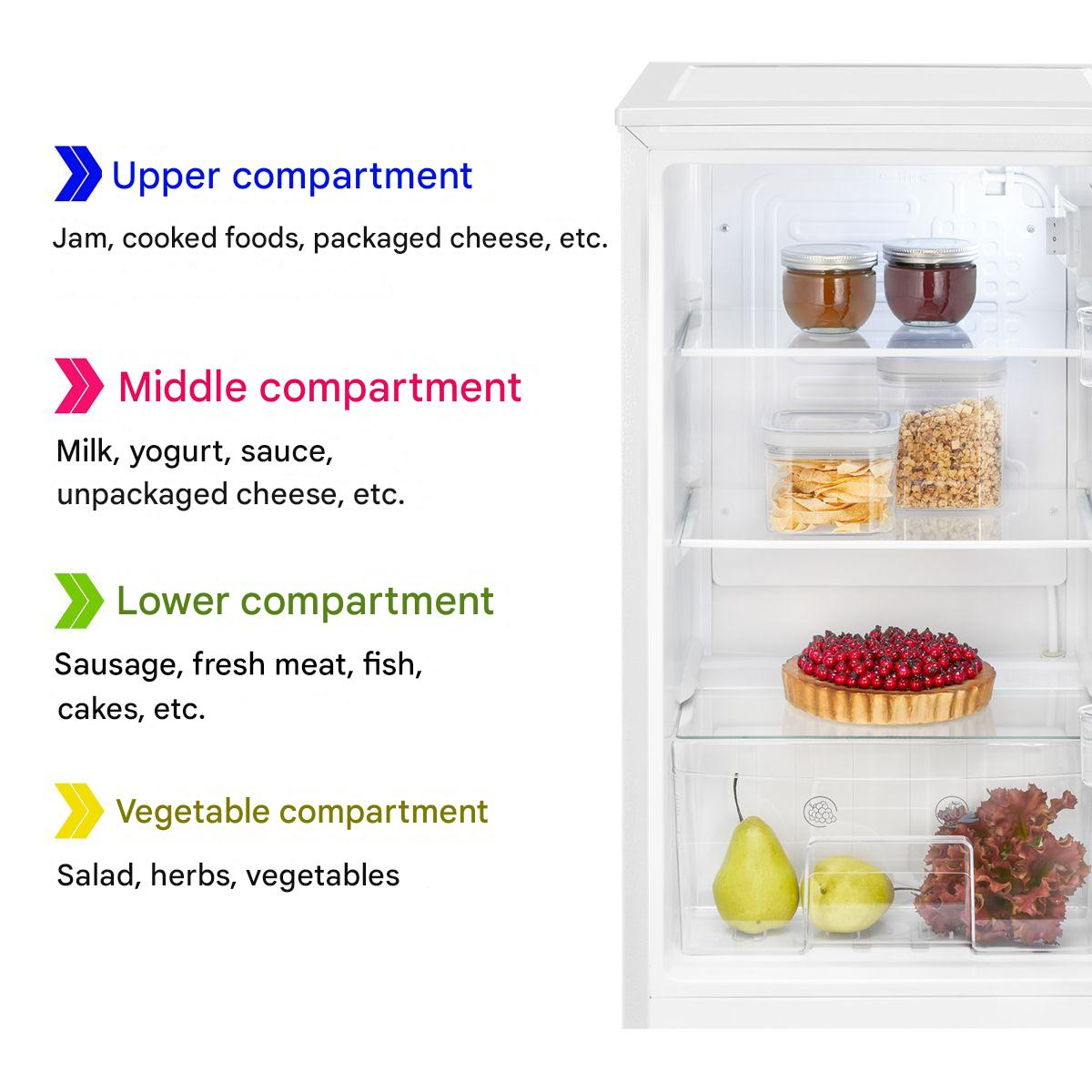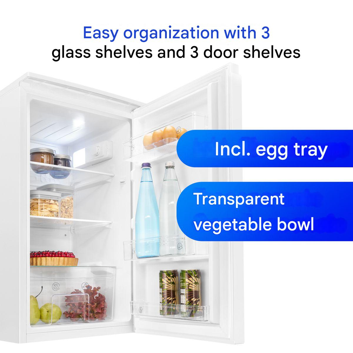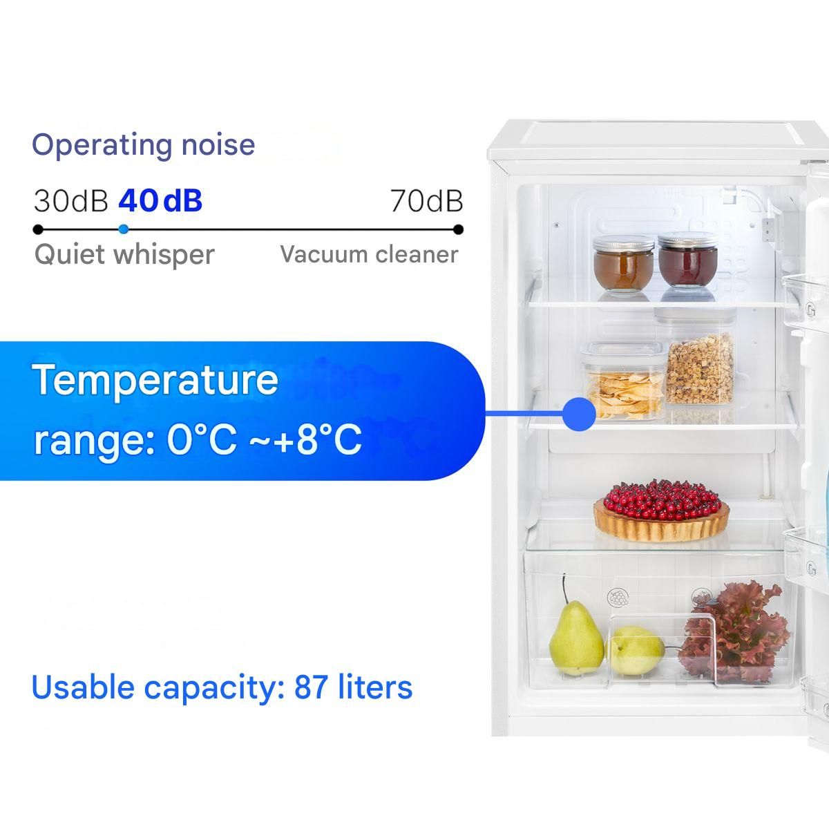 Frigiderul dispune de o capacitate totala de 87 litri, ceea ce-l face ideal pentru o cabana, o bucatarie de vara sau o casa de vacanta. Interiorul permite depozitarea alimentelor cat mai practic, usa avand 3 compartimente potrivite pentru depozitarea sticlelor de apa, lapte si un suport pentru oua.