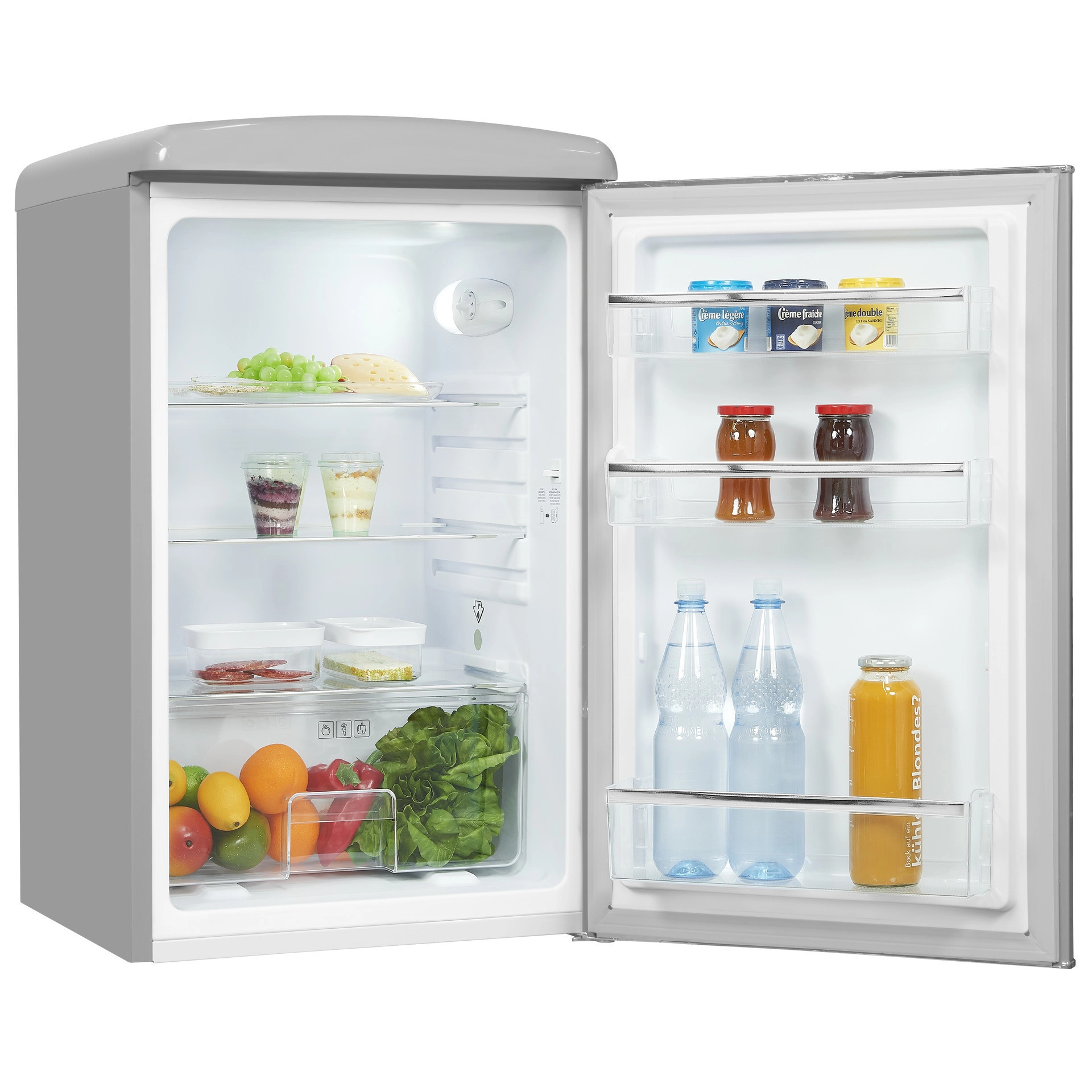 Interiorul permite depozitarea alimentelor cat mai practic, usa avand 3 compartimente potrivite pentru depozitarea sticlelor de apa, lapte si un suport pentru oua. Temperatura se poate regla cu ajutorul comutatorului rotativ situat in interior.