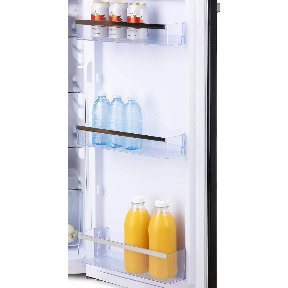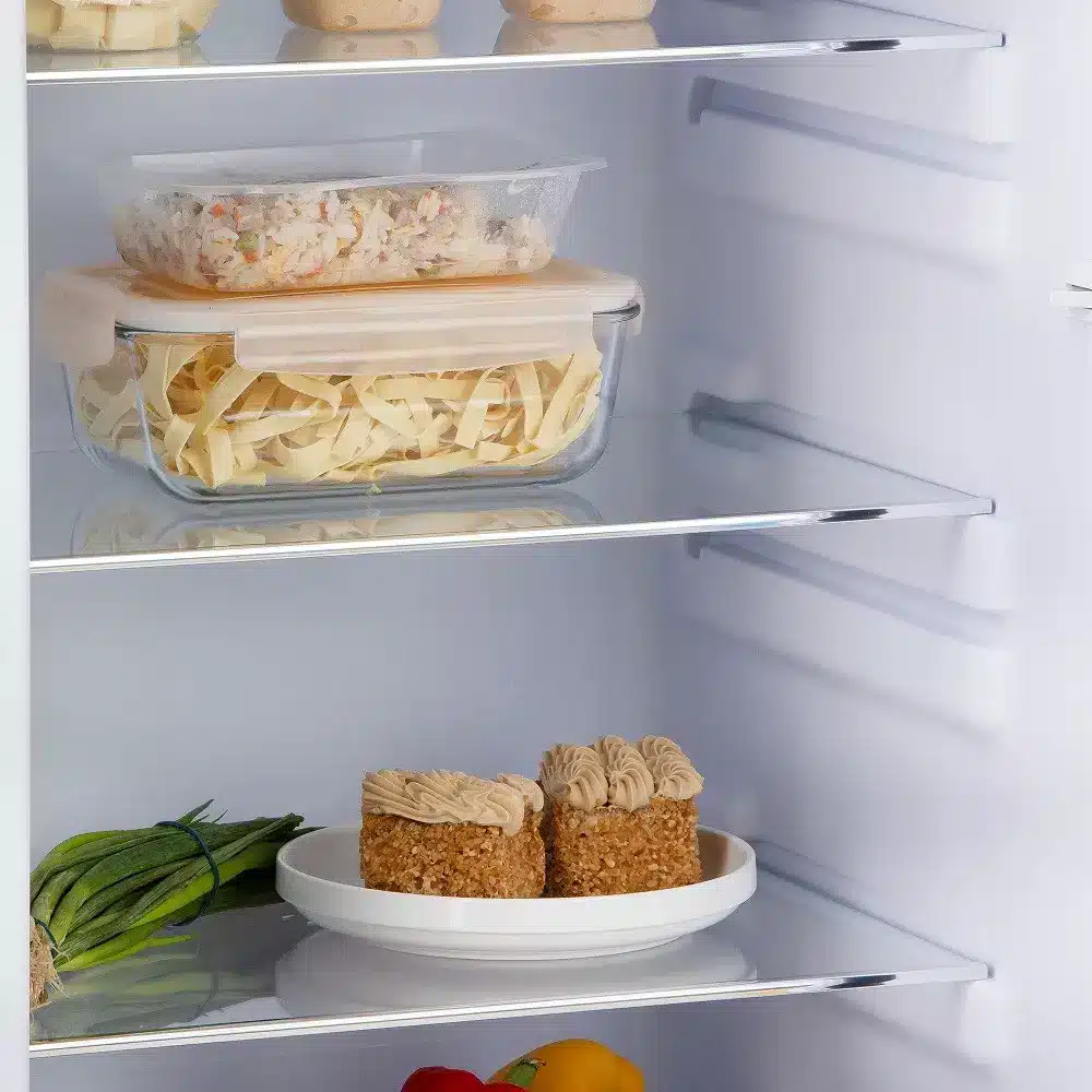 Rafturile din sticla securizata permit depozitarea alimentelor pe 4 niveluri, iar cele 3 compartimente de pe usa pot pastra borcanele si sticlele in siguranta.
