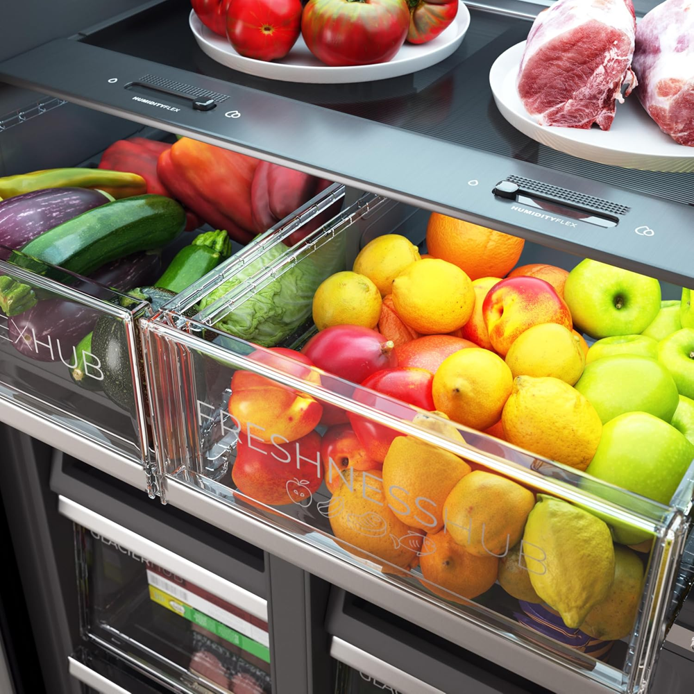 Rafturile din sticla securizata permit depozitarea alimentelor pe 3 niveluri, iar cele 6 compartimente de pe usa pot pastra bauturile sau sosurile la temperatura ideala. Mai mult, congelatorul este dotat cu 6 sertare etanse, ce faciliteaza organizarea si pastrarea la rece a alimentelor.