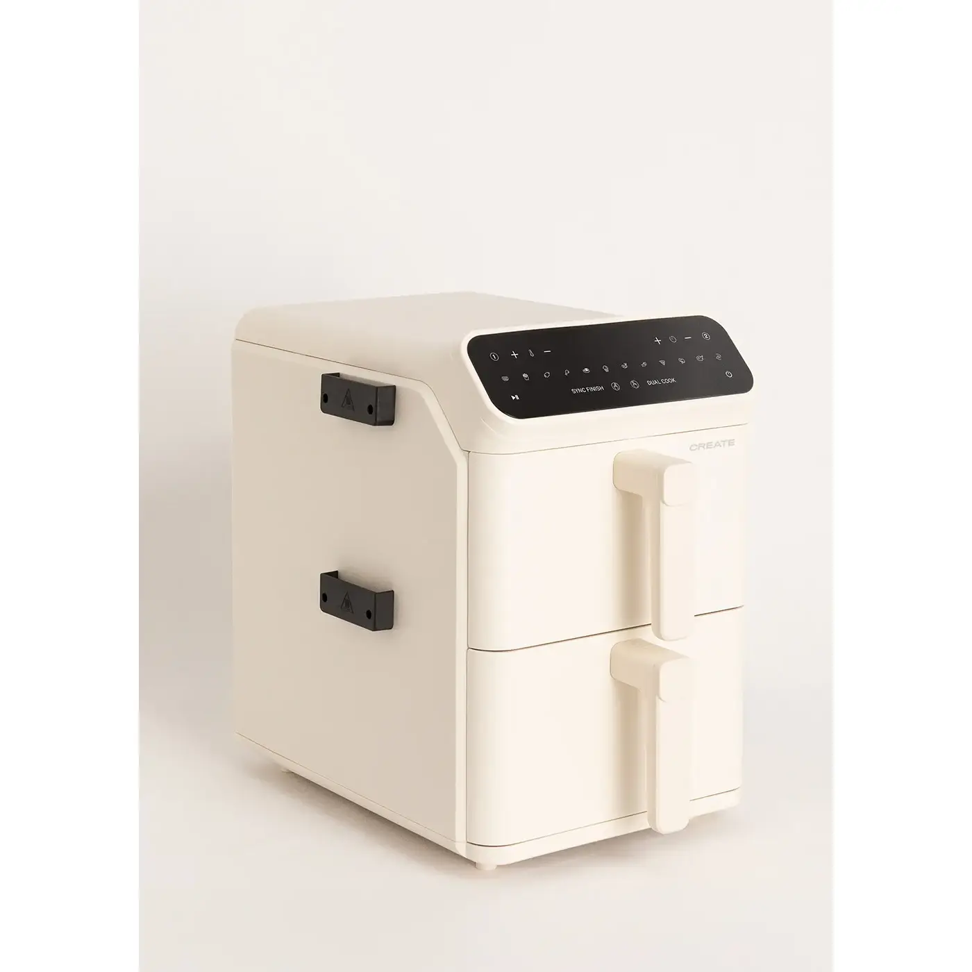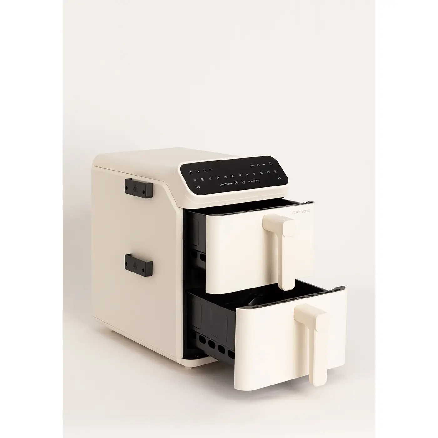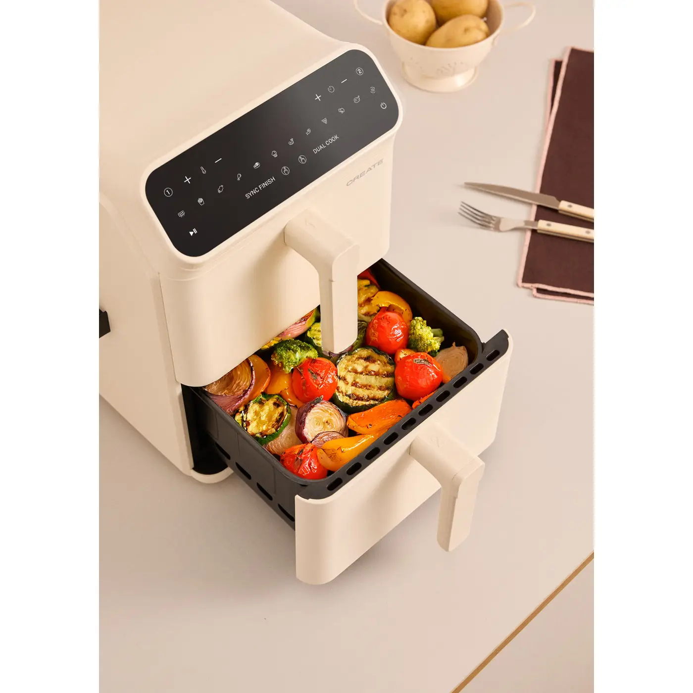 Air Fryerul Dual de la CREATE este un produs inovator cu un design modern si compact, gasindu-si locul in orice bucatarie. Mancarea se va gati uniform, fara pic de ulei! Salveaza timp si spatiu fara sa compromiti cantitatea de mancare cu friteuza de la CREATE. Datorita designului sau smart vertical cu doua sertare de preparare, eliberezi suprafata utila a blatului, fiind ideala pentru bucatarii mici.