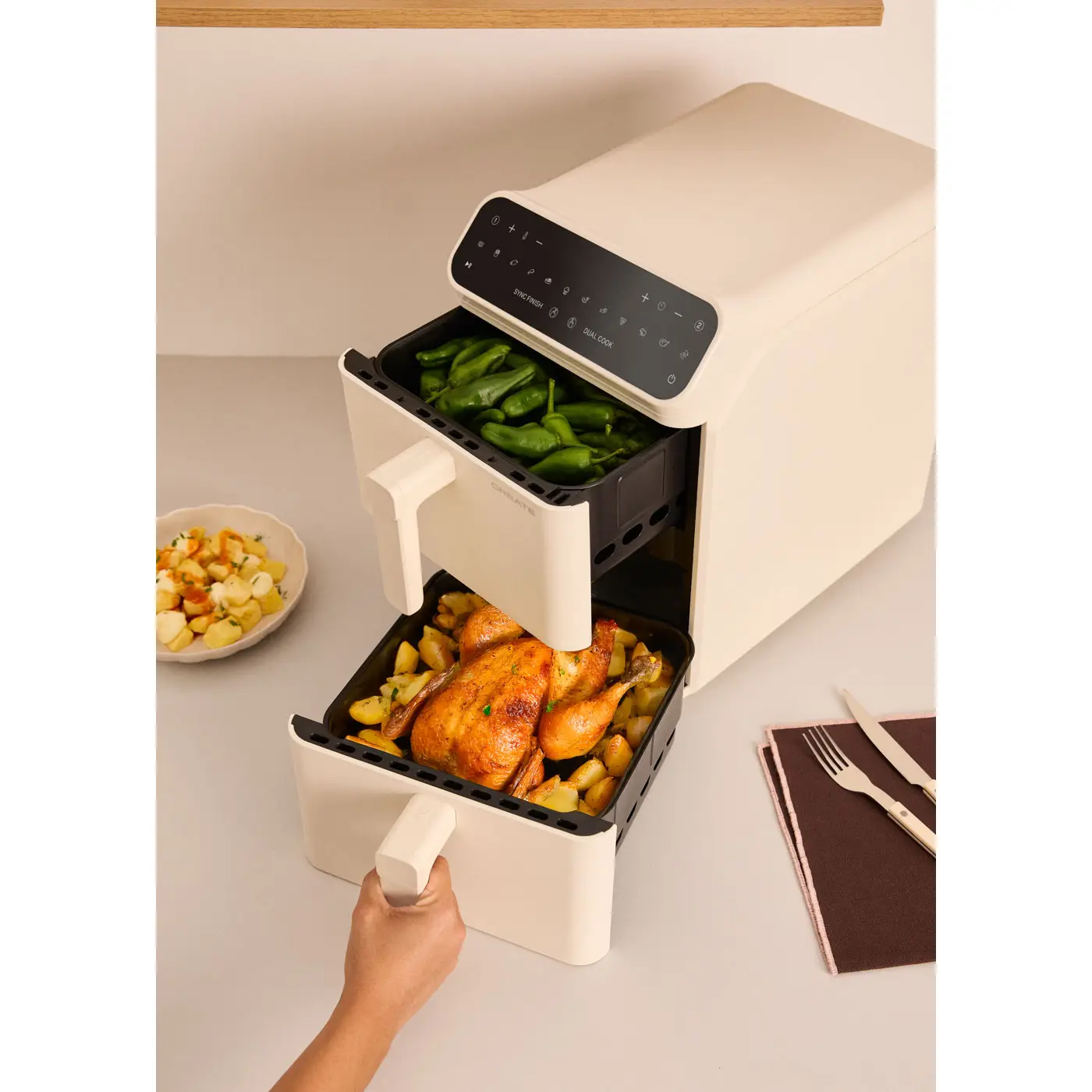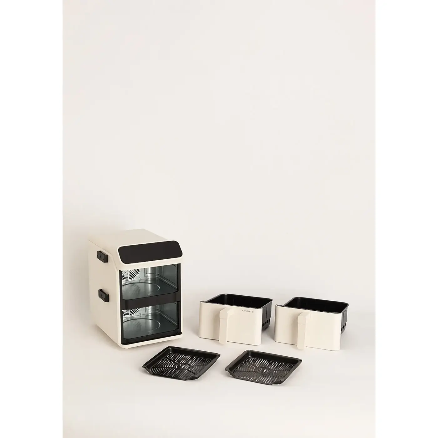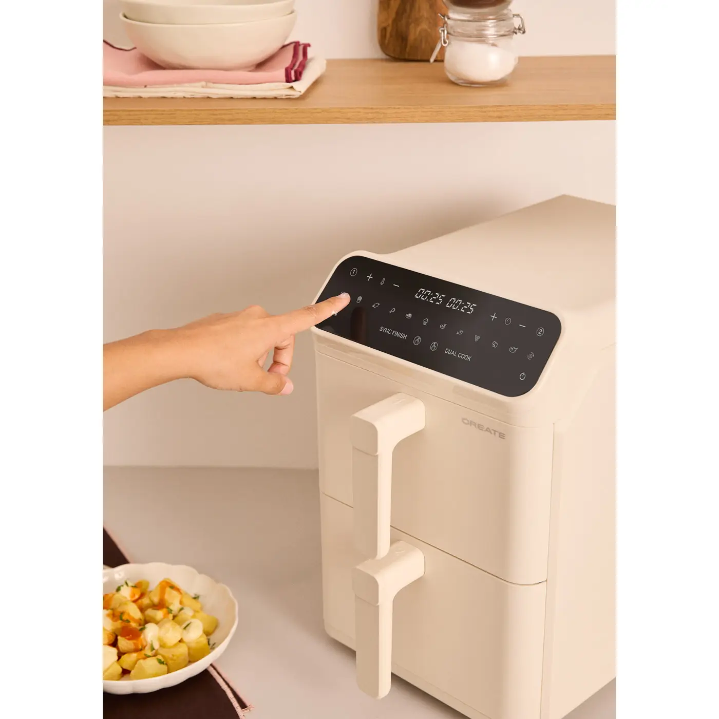 Air Fryerul Dual de la CREATE este un produs inovator cu un design modern si compact, gasindu-si locul in orice bucatarie. Mancarea se va gati uniform, fara pic de ulei! Salveaza timp si spatiu fara sa compromiti cantitatea de mancare cu friteuza de la CREATE. Datorita designului sau smart vertical cu doua sertare de preparare, eliberezi suprafata utila a blatului, fiind ideala pentru bucatarii mici.
