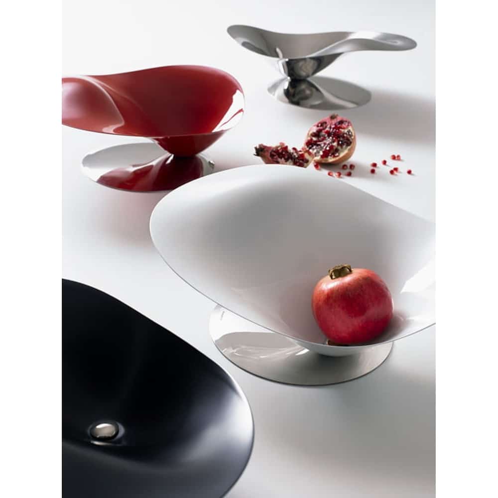 Fructiera Petalo Bugatti atrage atentia inca de la prima vedere si sigur va arata grozav in orice spatiu. Cu un aspect aproape suspendat, forma sa organica se sprijina pe o placa de otel. Foarte modern si elegant, va fi plusul de eleganta in casa ta. Bolul de fructe si piesa centrala, asezata pe o foaie de otel, are o forma cinetica.