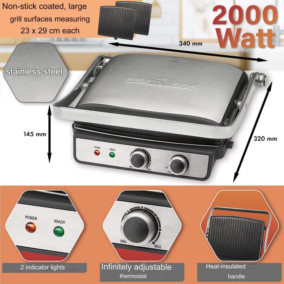 In functie de preparatul ales, puteti selecta una dintre cele 6 trepte de temperatura. Cu o putere de 2000 W, friptura va iesi perfect!