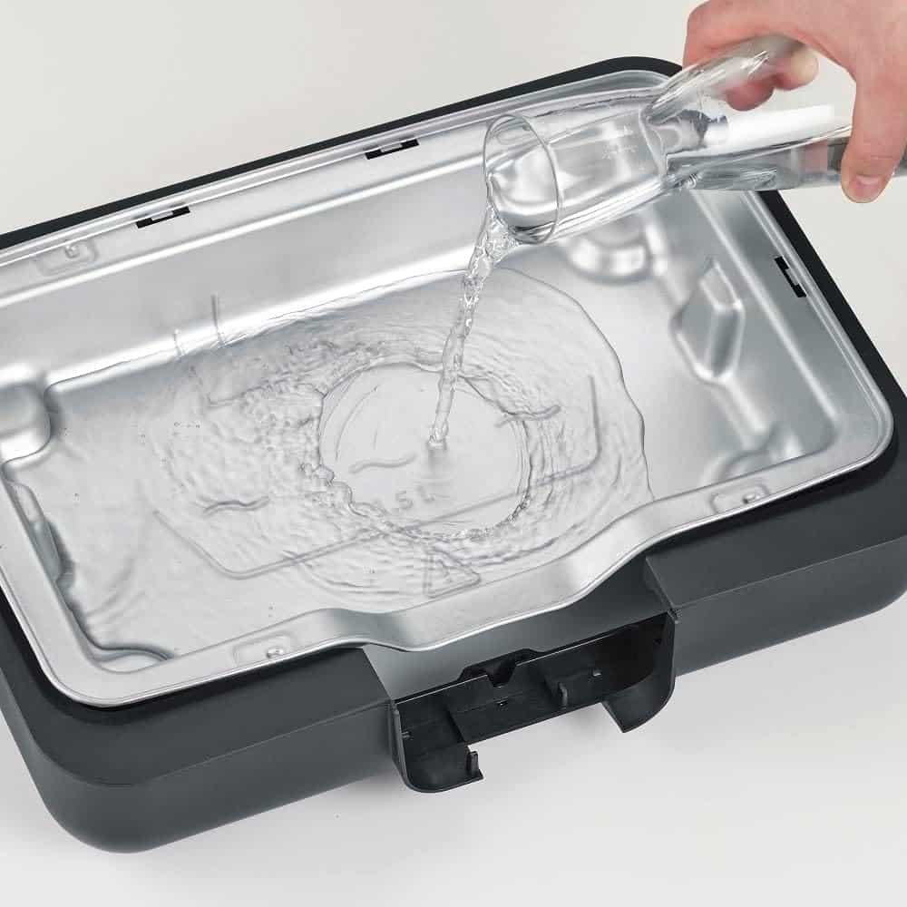 Gratarul este prevazut cu un vas pentru apa care poate fi umplut pentru a reduce nivelul de fum si mirosurile atunci cand gatiti in interior.