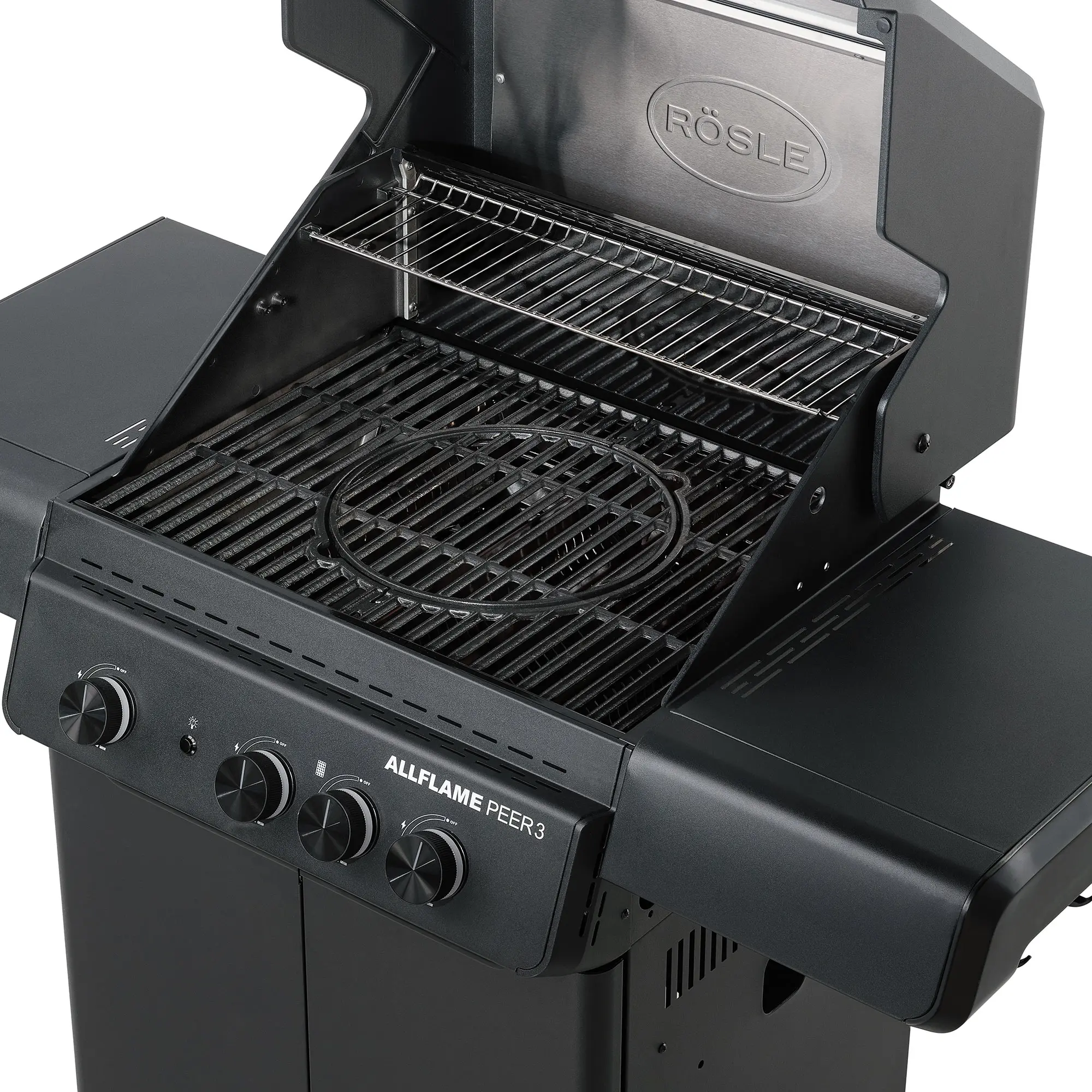 Gratarul pe gaz Rosle ALLFLAME Peer 3, echipat cu arzatoare HEATSPIRE din inox (3 × 3,5 kW), ofera o incalzire rapida, o distributie uniforma a caldurii si eficienta reala in consumul de gaz. Zona integrata CRISPZONE (3 kW) atinge pana la 450 °C, perfecta pentru un “sear” profesional, cu crusta crocanta si interior suculent.