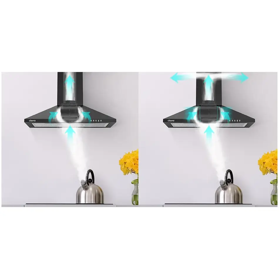 Hota de la Ciarra se deosebeste de cele conventionale si prin functia inovativa de ventilare si recirculare a aerului prin filtrele de carbon incluse. Cu Ciarra bucataria ta va avea mereu un aer lipsit de mirosuri neplacute, intrucat aerul initial evacuat in exterior este filtrat si recirculat inapoi in bucatarie.