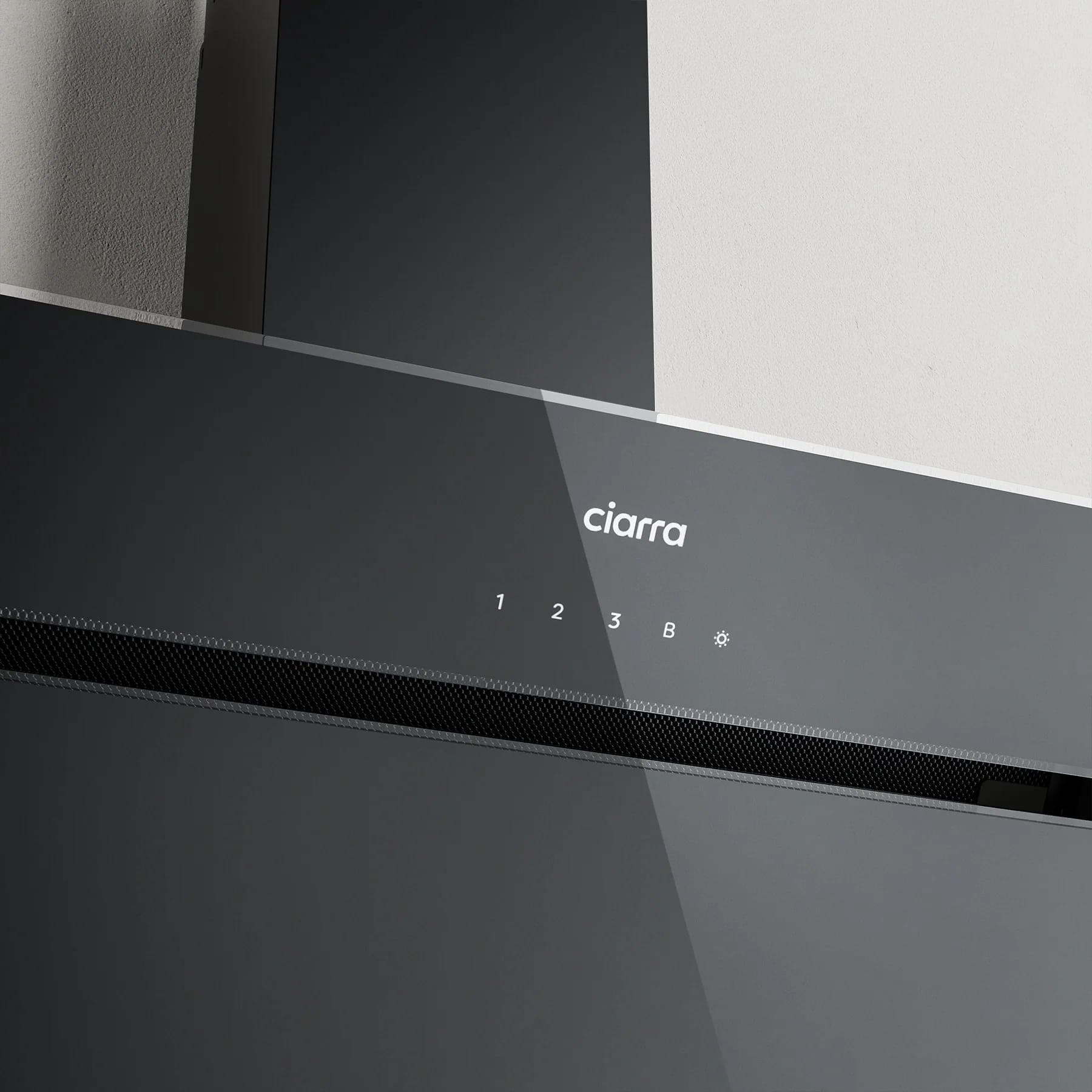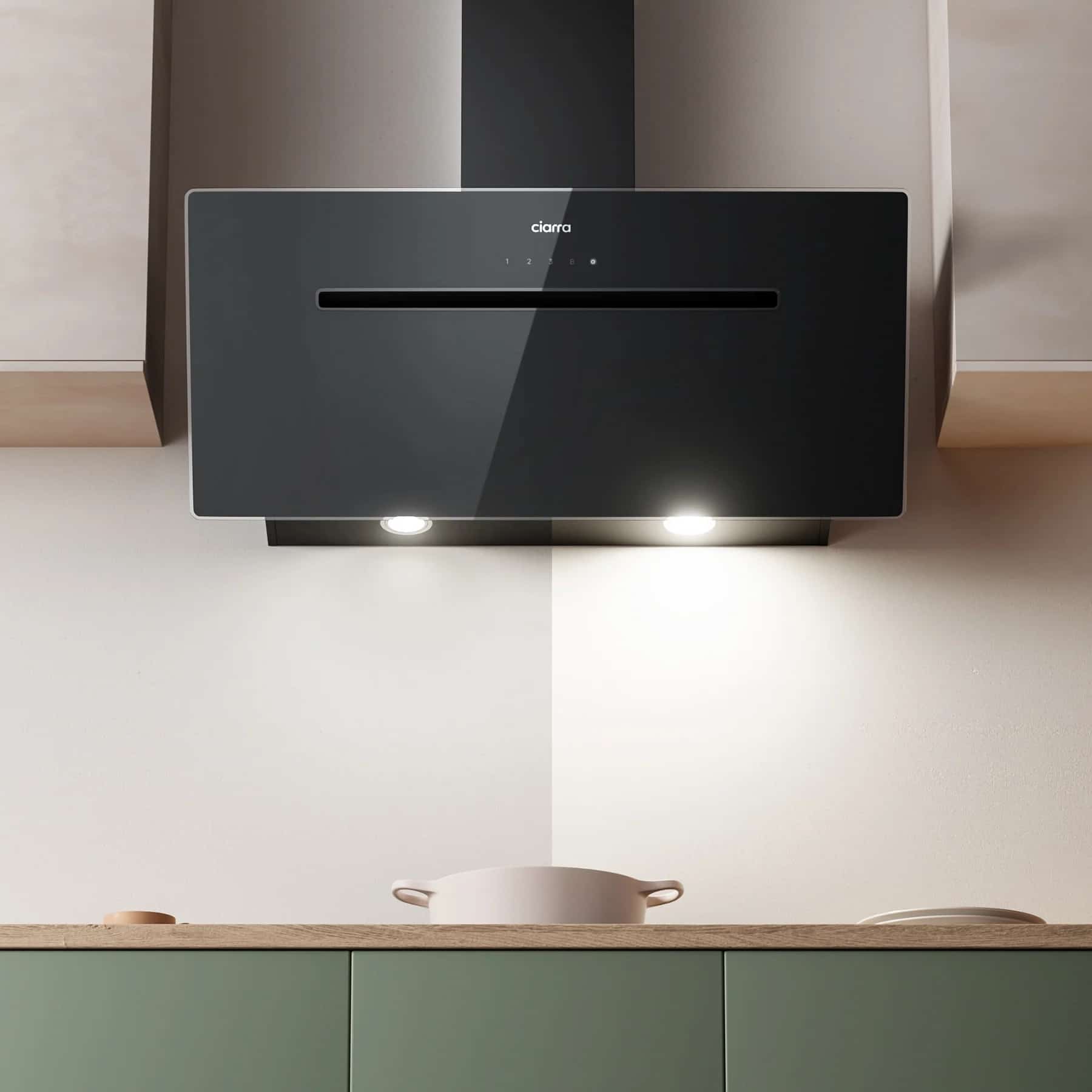 Hota verticala de la Ciarra are un aspect elegant, potrivit pentru orice bucatarie, carcasa frontala din sticla este atractia acesteia datorita modului de actionare prin senzor touch. Aceasta va deveni piesa de rezistenta in orice bucatarie, datorita culorii negre si a aspectului simplist si elegant.