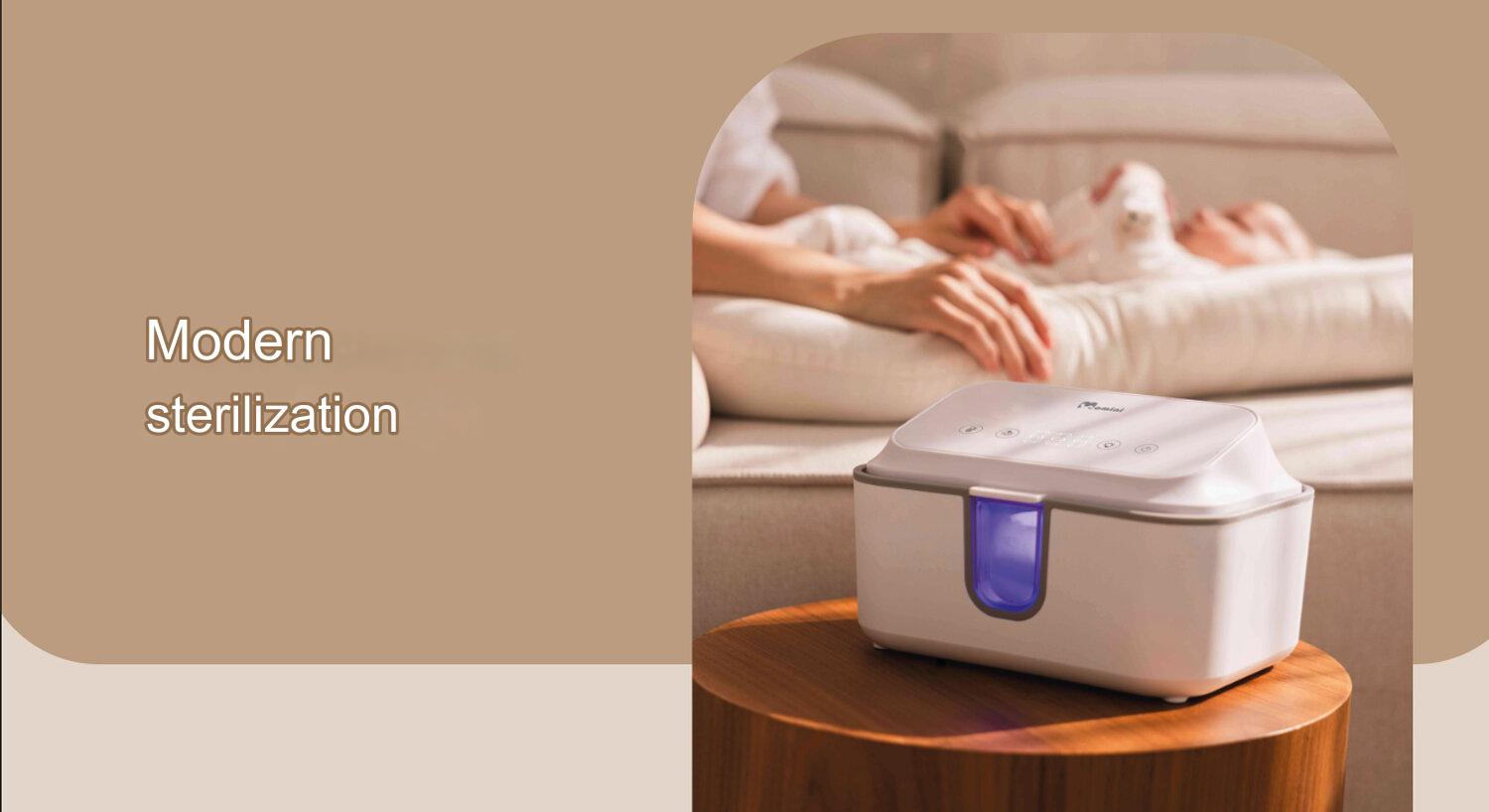 Cutia este dotata si cu functia de sterilizare, avand o lumina UV, ideala pentru dezinfectarea suzetelor, tetinelor, instrumentelor de manichiura si altor lucruri de prin casa precum chei, telefoane, pentru un mediu sigur pentru cel mic.