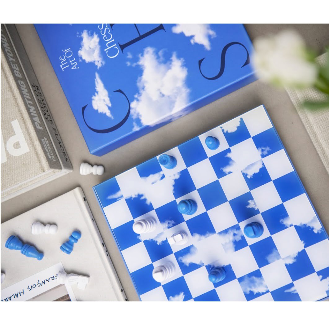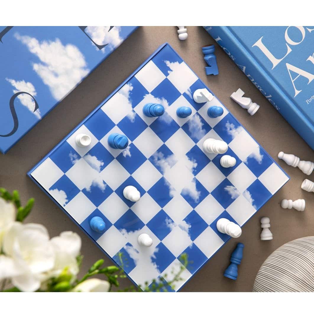 Jocul de sah Clouds are un design vesel cu imprimeu cu nori. Piesele si tabla de joc sunt fabricate din lemn iar pe suprafata tablei este montat un strat subtire de acrilica.