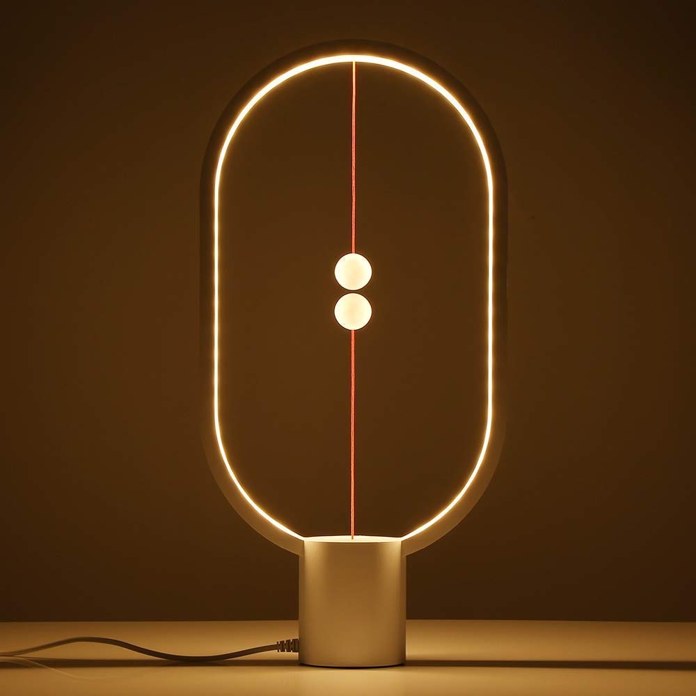 Cu un cadru oval modern si intrerupator magnetic unic, lampa este activata prin unirea celor doua bile magnetice suspendate, creand un efect spectaculos. Lumina calda si uniforma o face ideala pentru birou, dormitor sau living.