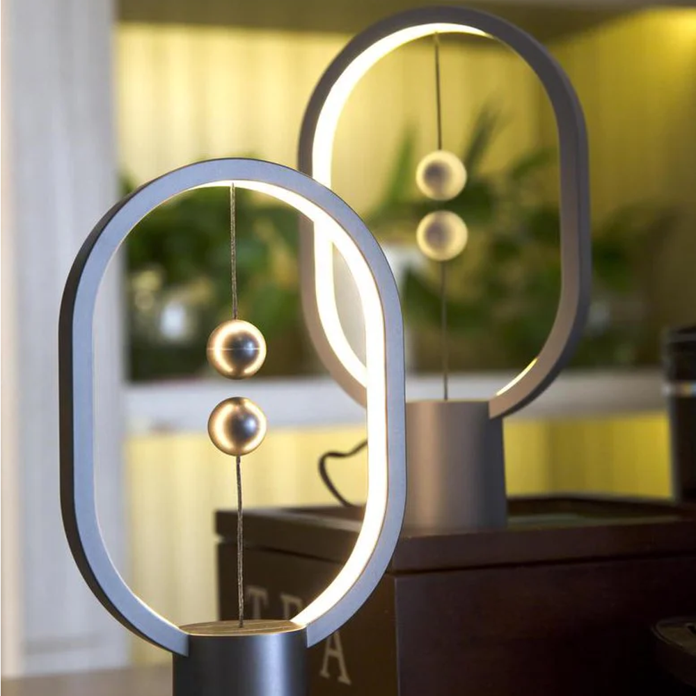 Cu un cadru oval modern si intrerupator magnetic unic, lampa este activata prin unirea celor doua bile magnetice suspendate, creand un efect spectaculos. Lumina calda si uniforma o face ideala pentru birou, dormitor sau living.