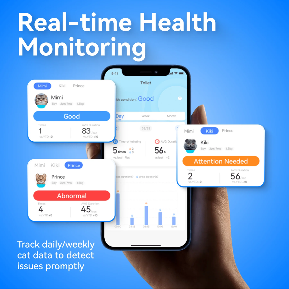 Cu aplicatia Catlink poti monitoriza sanatatea animalului de companie, inregistrand fiecare vizita la BayMax Lite, cat timp este petrecut in ea, dar si greutatea pisicii. De asemenea, litiera are inclusa functia de a monitoriza mai multe pisici in acelasi timp pentru a le analiza obiceiurile si starea generala de sanatate.