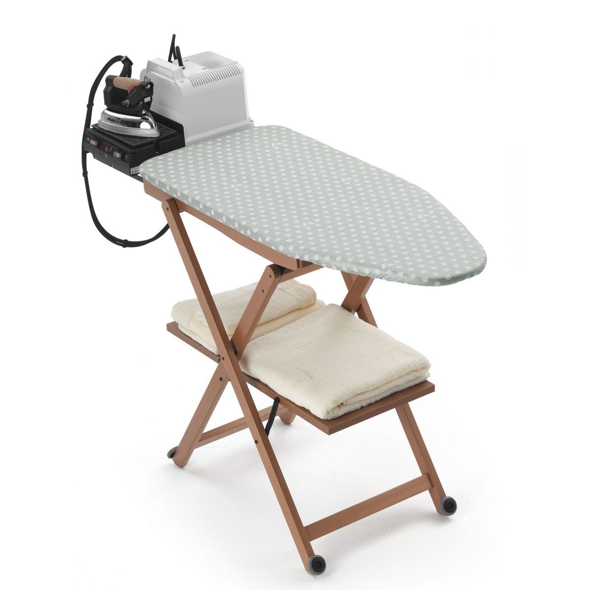 Avand o structura din lemn masiv de fag, masa de calcat Stirocomodo este rezistenta la uzura, iar sistemul de pliere este foarte usor. Partea superioara este dintr-o panza din bumbac, imbracata intr-un strat termorezistent pentru o utilizare sigura.
