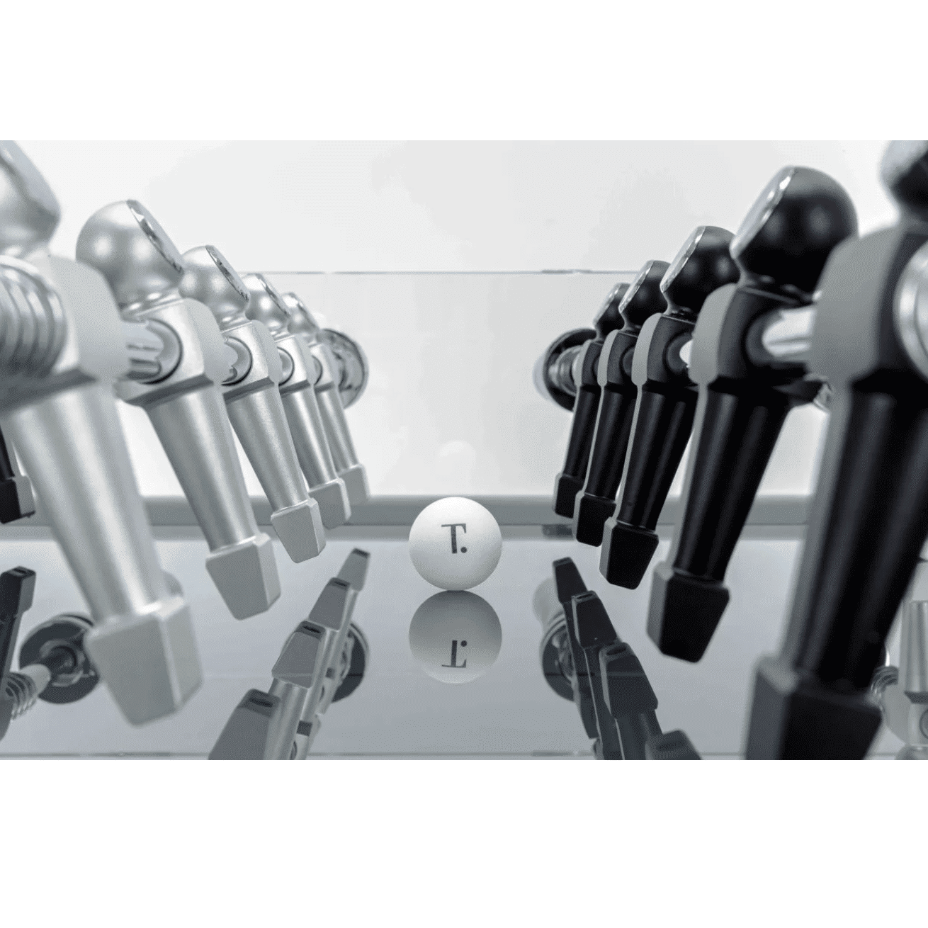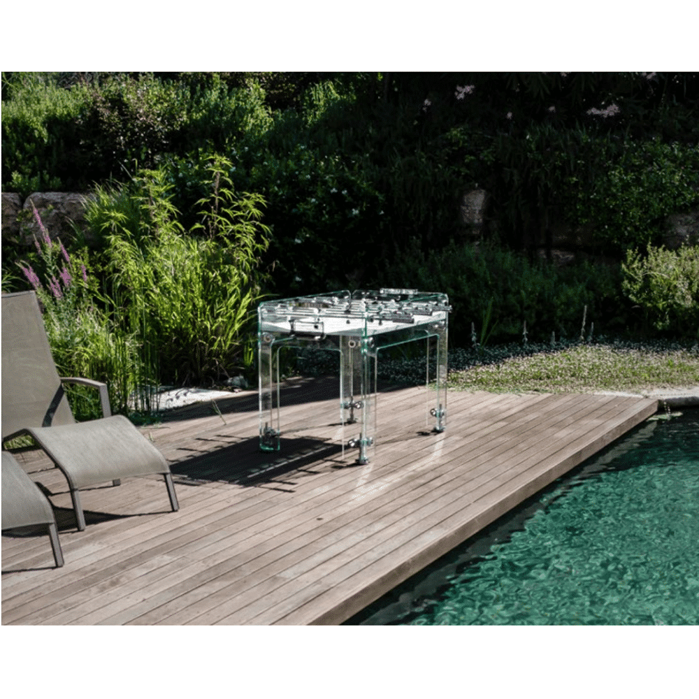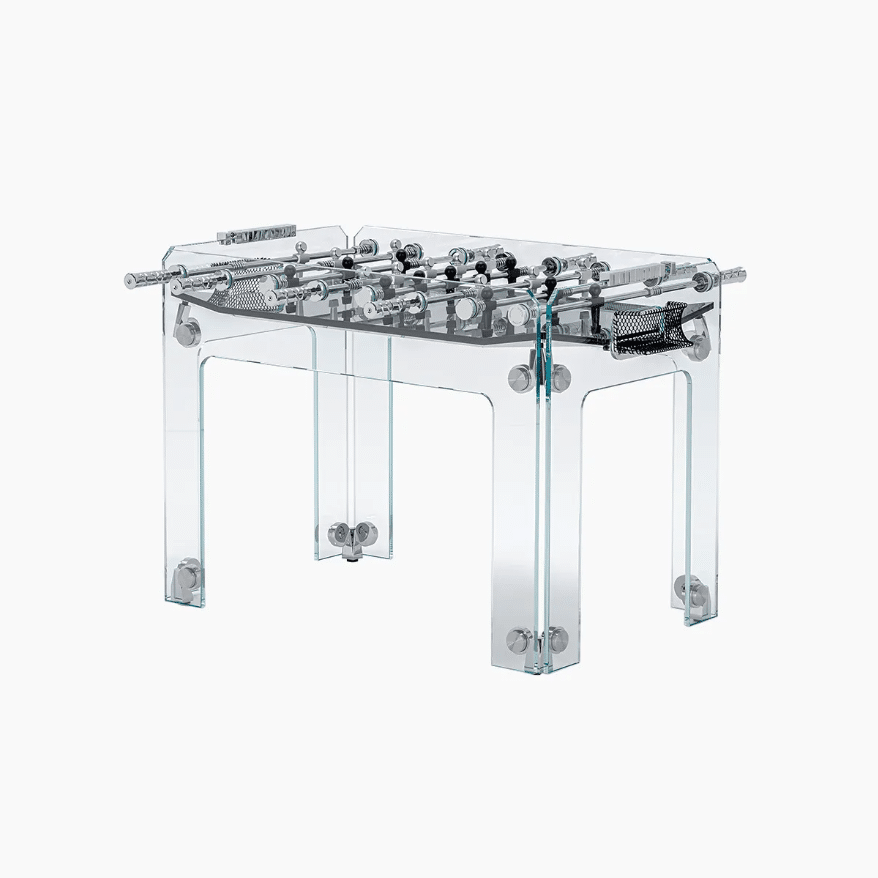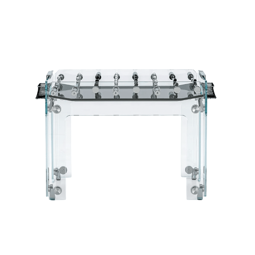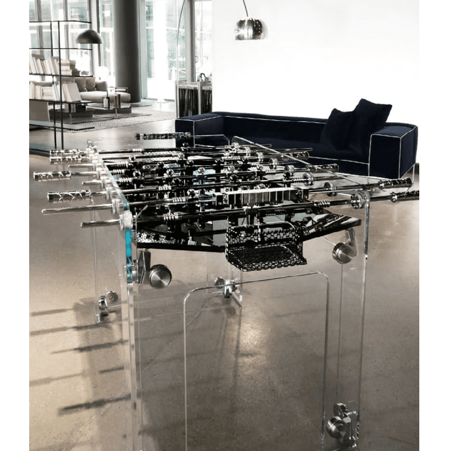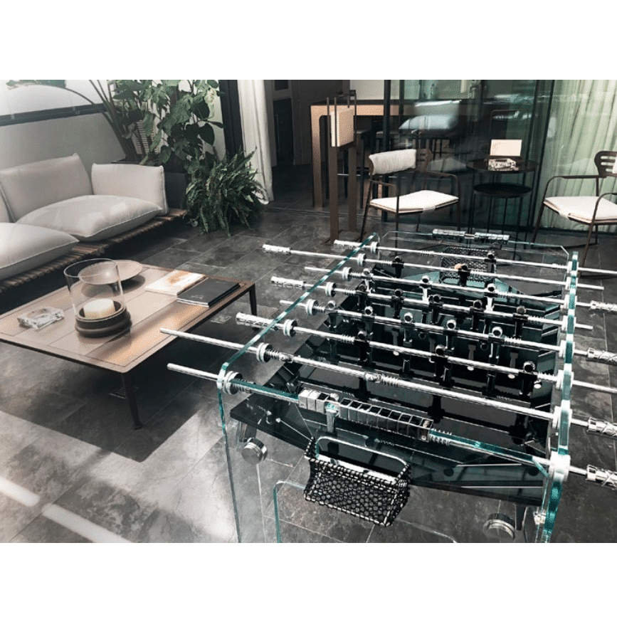 Masa de foosball de lux este o opera de arta in sine, combinand stralucirea cristalului cu elemente argintii din crom si otel. Construita cu maiestrie de artizanii italieni, masa are un aer futurist, fiind potrivita intr-o estetica moderna. Suprafata de joc este realizata din sticla fumurie laminata, oferind o vedere spectaculoasa asupra miscarilor rapide ale jucatorilor.