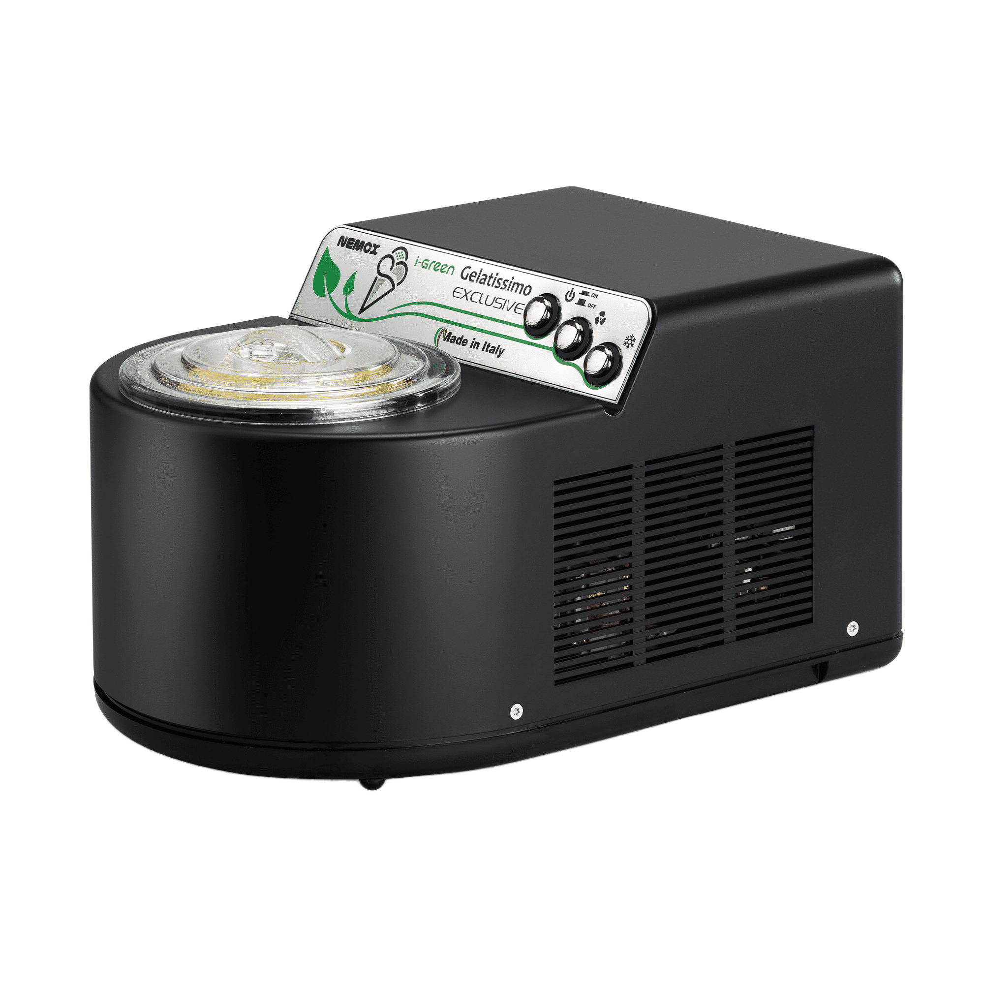 Panoul de control a fost conceput de designeri internationali pentru a reflecta spiritul eco-friendly al colectiei. Aveti la dispozitie trei comutatoare: unul principal, unul pentru pornirea paletei si unul pentru pornirea sistemului de refrigerare. Compresorul este echipat cu un sistem de siguranta pentru a preveni posibilele deteriorari ale motorului, facand din aparatul Gelatissimo Exclusive un aparat sigur si eficient.