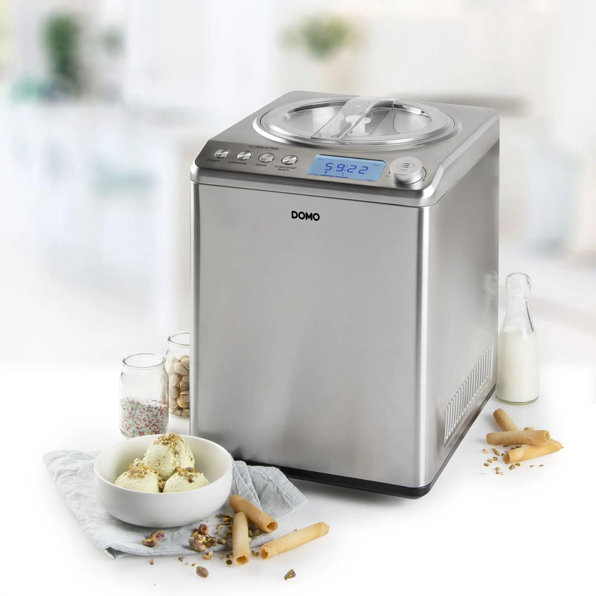 Inghetata cremoasa, sorbet dulce-acrisor sau iaurt inghetat delicios intr-o zi calduroasa de vara? DOMO Ice Cream PRO este un aparat de inghetata complet automat potrivit pentru toate acestea, cu o unitate de racire incorporata, si functie de pastrare la rece.