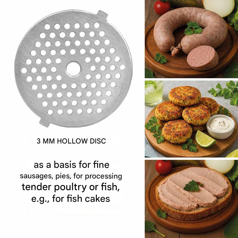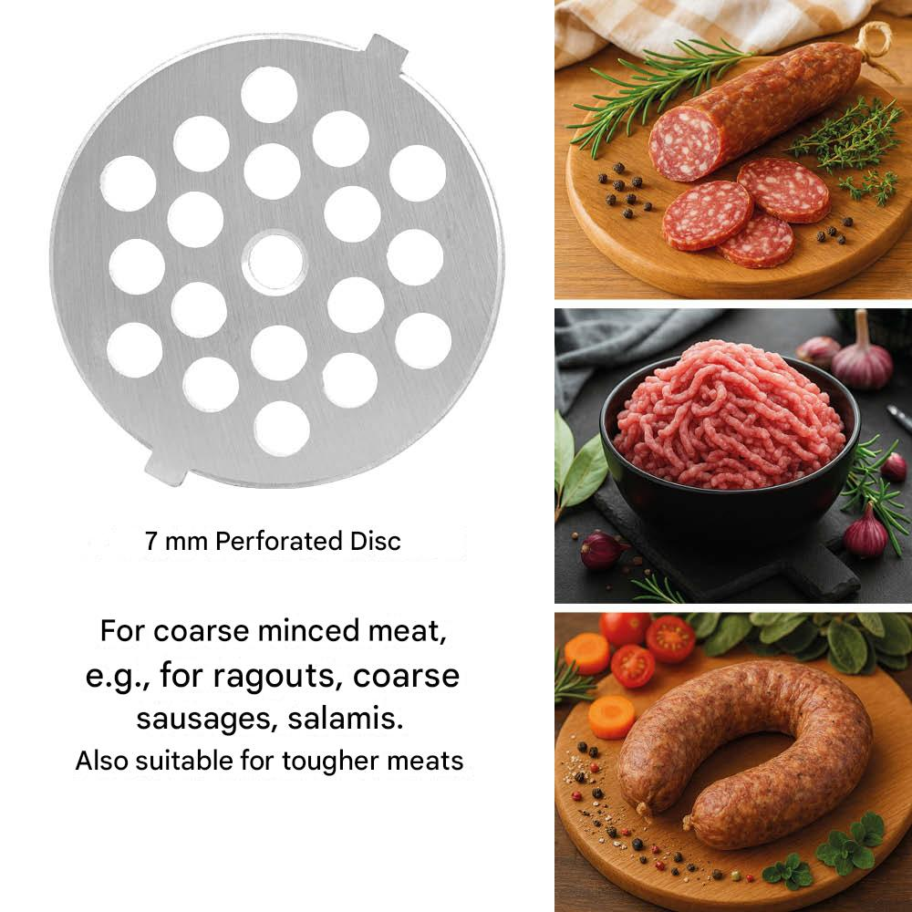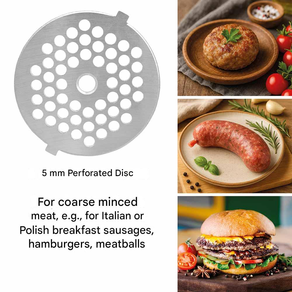 Include: 3 discuri perforate din otel inoxidabil (3 mm, 5 mm, 7 mm), atasamente pentru carnati kebbe si fursecuri, presa pentru burger (doua marimi), spatiu de depozitare pentru accesorii