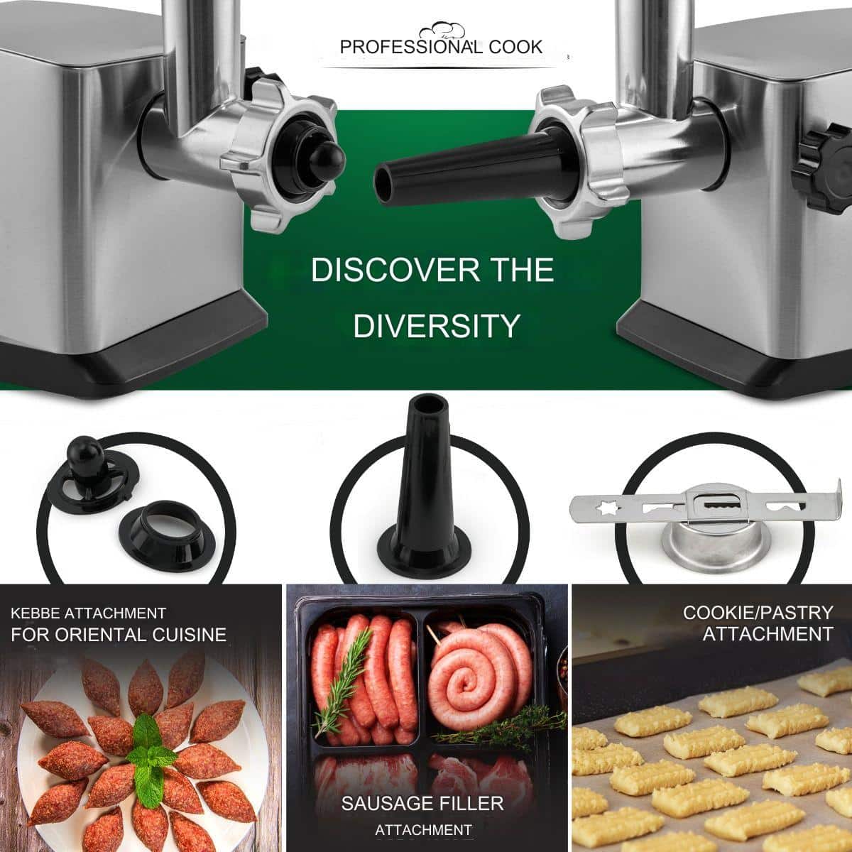 Accesorii incluse: atasament Kebbe, atasament carnati, atasament biscuiti