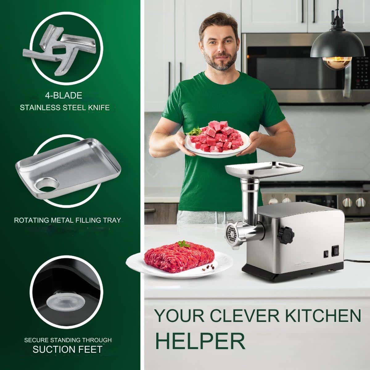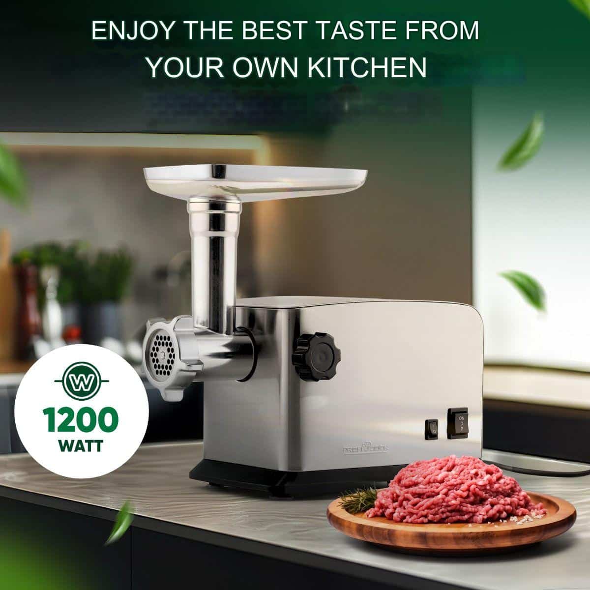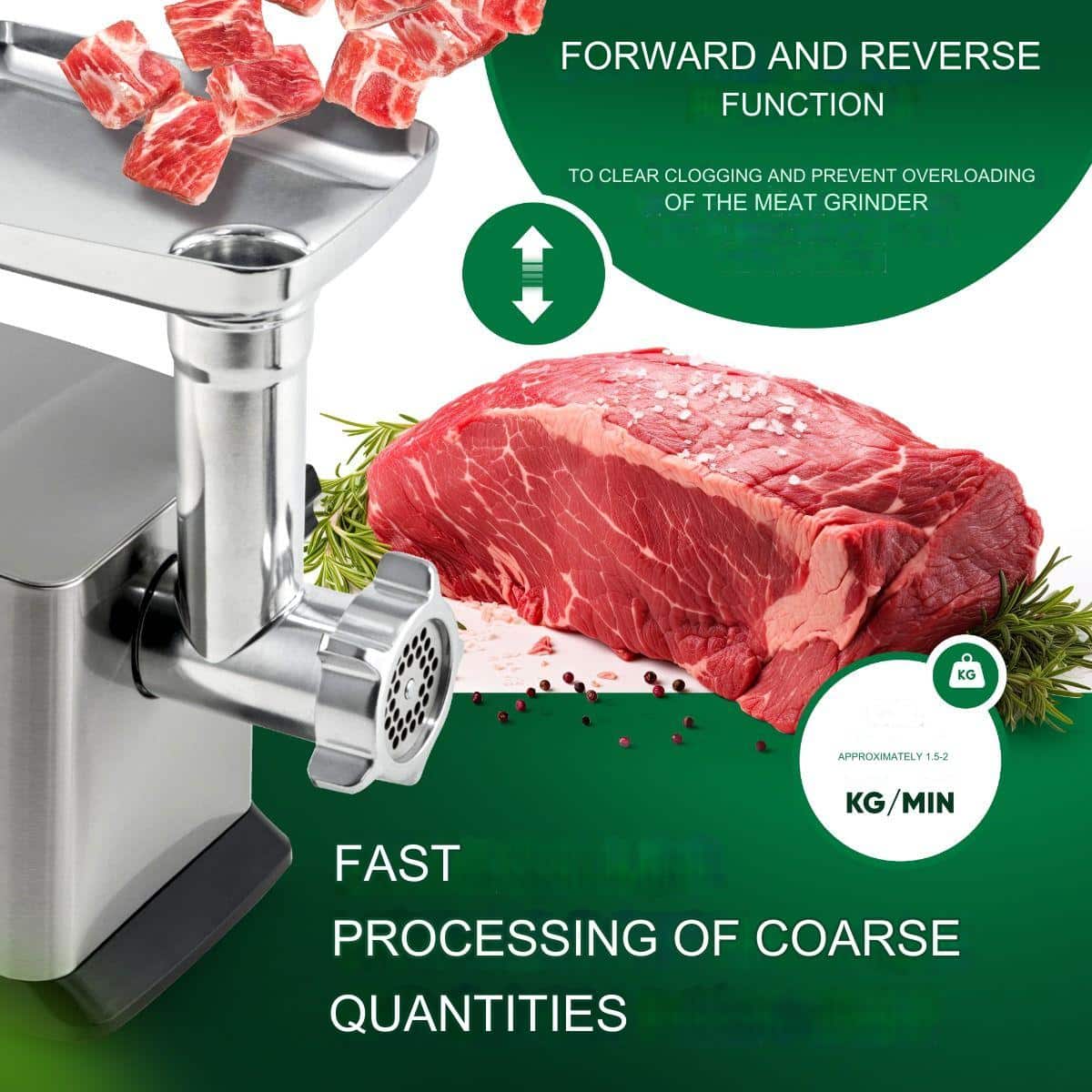 Motorul puternic de 1200 W garanteaza o procesare rapida a carnii, fara sa depui efort, iar accesoriile sunt usor de schimbat datorita inelului metalic.