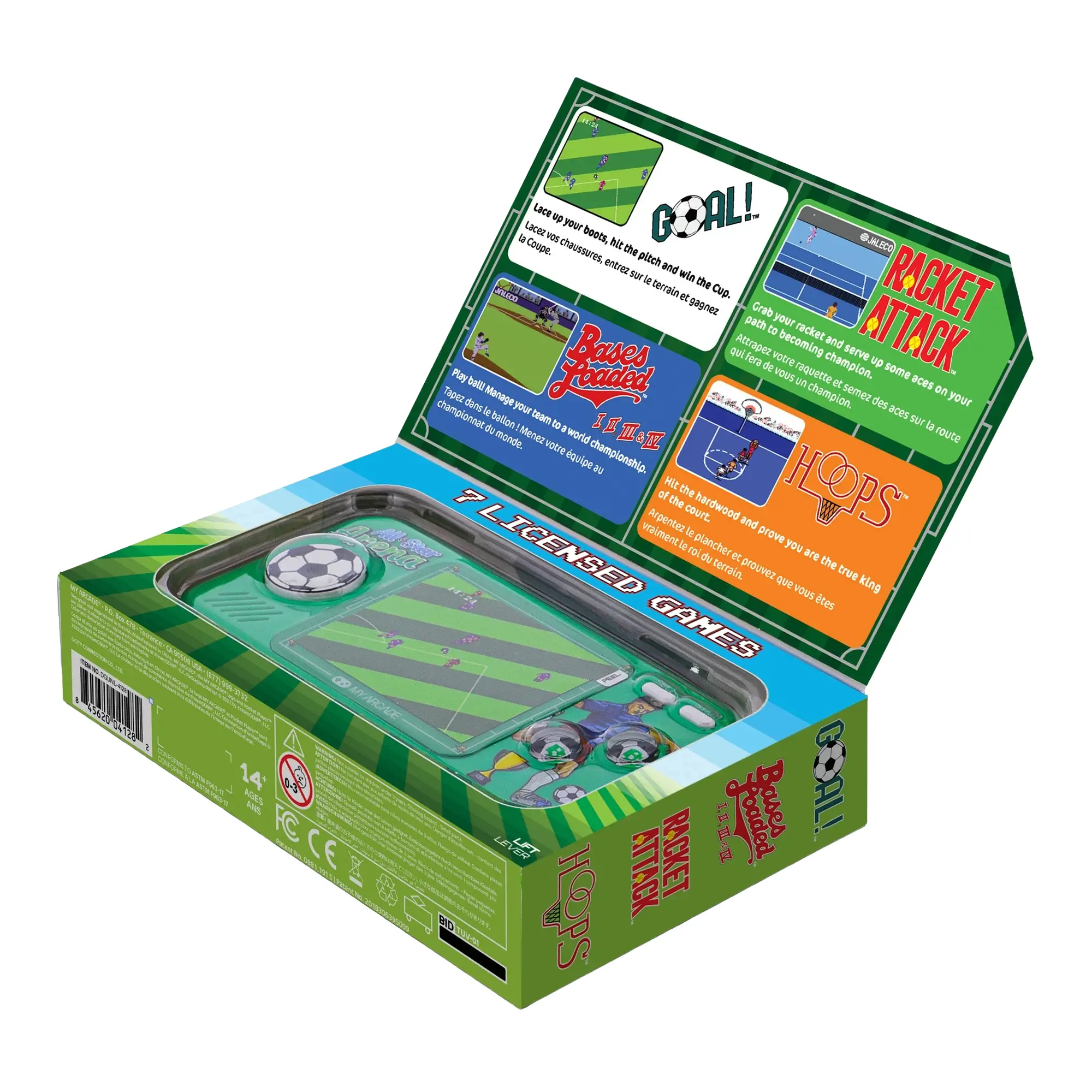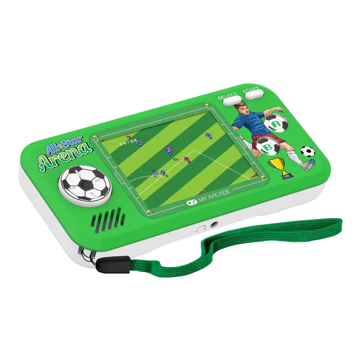 MyArcade te intampina cu cele mai cunoscute titluri retro, adunate in consola portabila All-Star Arena! Mini consola de buzunar iti ofera 7 jocuri cu licenta Jaleco™, perfecte pentru iubitorii de sport. Cu o dimensiune mai mica decat un smartphone, acest device este atat de compact incat il poti lua cu tine in buzunar sau in geanta.