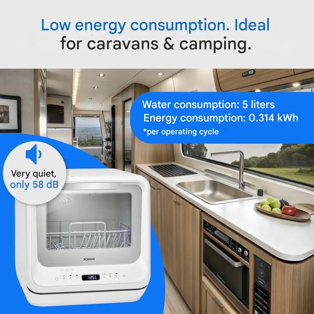 Ideala pentru drumetii cu rulota, birouri sau pentru bucatarii mici, mini masina de spalat vase de la Bomann este accesoriul care iti va usura munca zilnica datorita dimensiunii compacte si a sistemului intuitiv de operare.