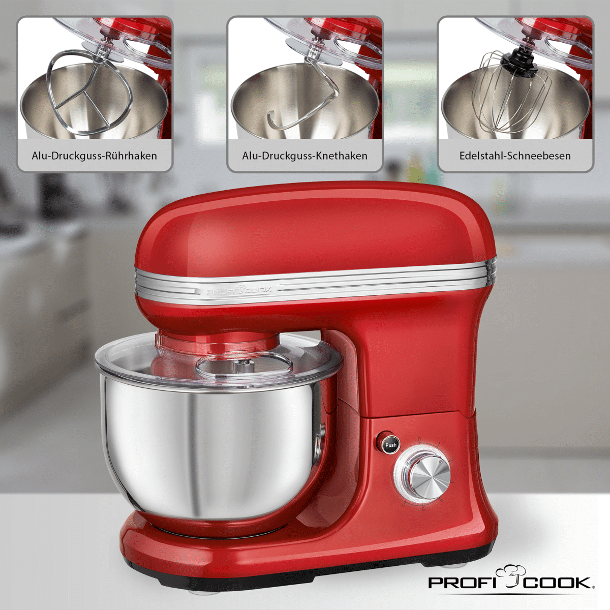 Preparea aluaturilor pentru prajituri, a cremelor si a friscai devine usoara atunci cand folosim robotul de bucatarie de la Profi Cook, datorita puterii de 1200 W si a vasului incapator de 5 litri fabricat din otel inoxidabil.
