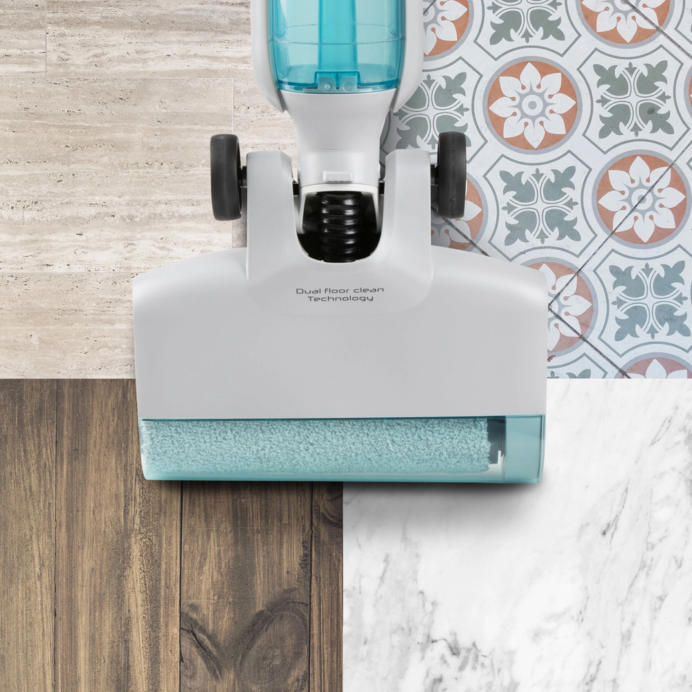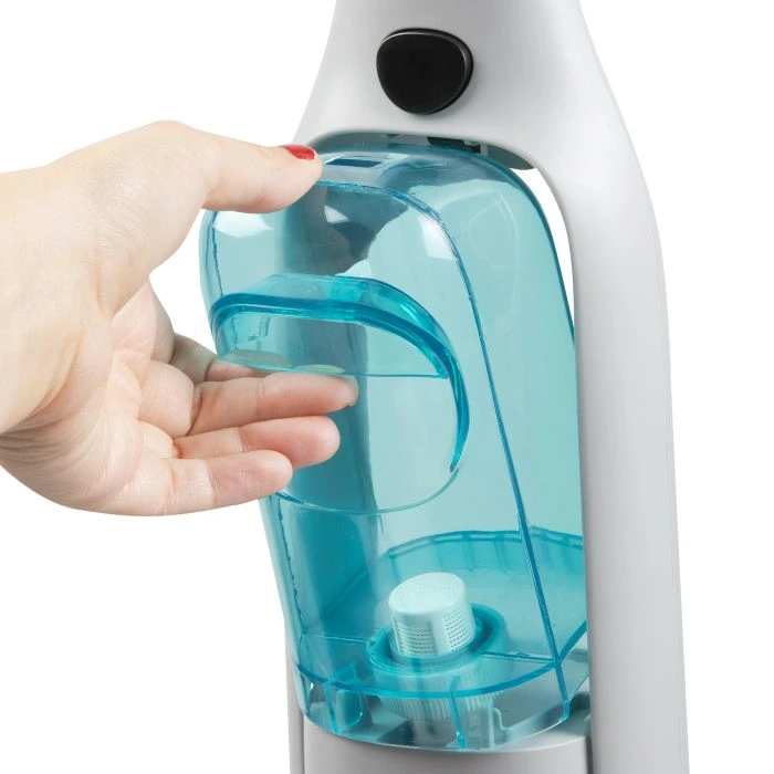 Datorita rezervorului dual, dispozitivul foloseste doar apa curata, murdaria fiind colectata in recipientul inferior! Dotat cu o perie rotativa, aparatul vertical aluneca usor pe orice fel de suprafata, chiar si pe marmura.
