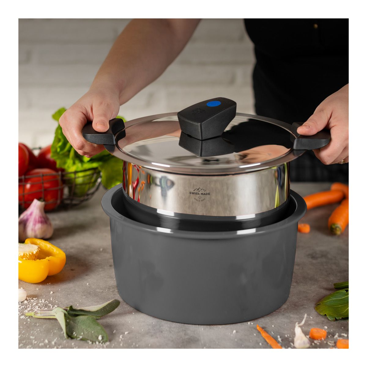 Fabricata din materiale de inalta calitate, aceasta oala te va ajuta sa gatesti sanatos, sa economisesti pana la 60% din energia electrica, sa pastrezi mancarea fierbinte pana la 2 ore, insa si sa mentii aromele naturale ale alimentelor. Alaturi de aceasta oala, pentru a mentine un aspect modern si elegant al bucatariei poti incerca si produsele din gama de cutite si seturi de cutite.