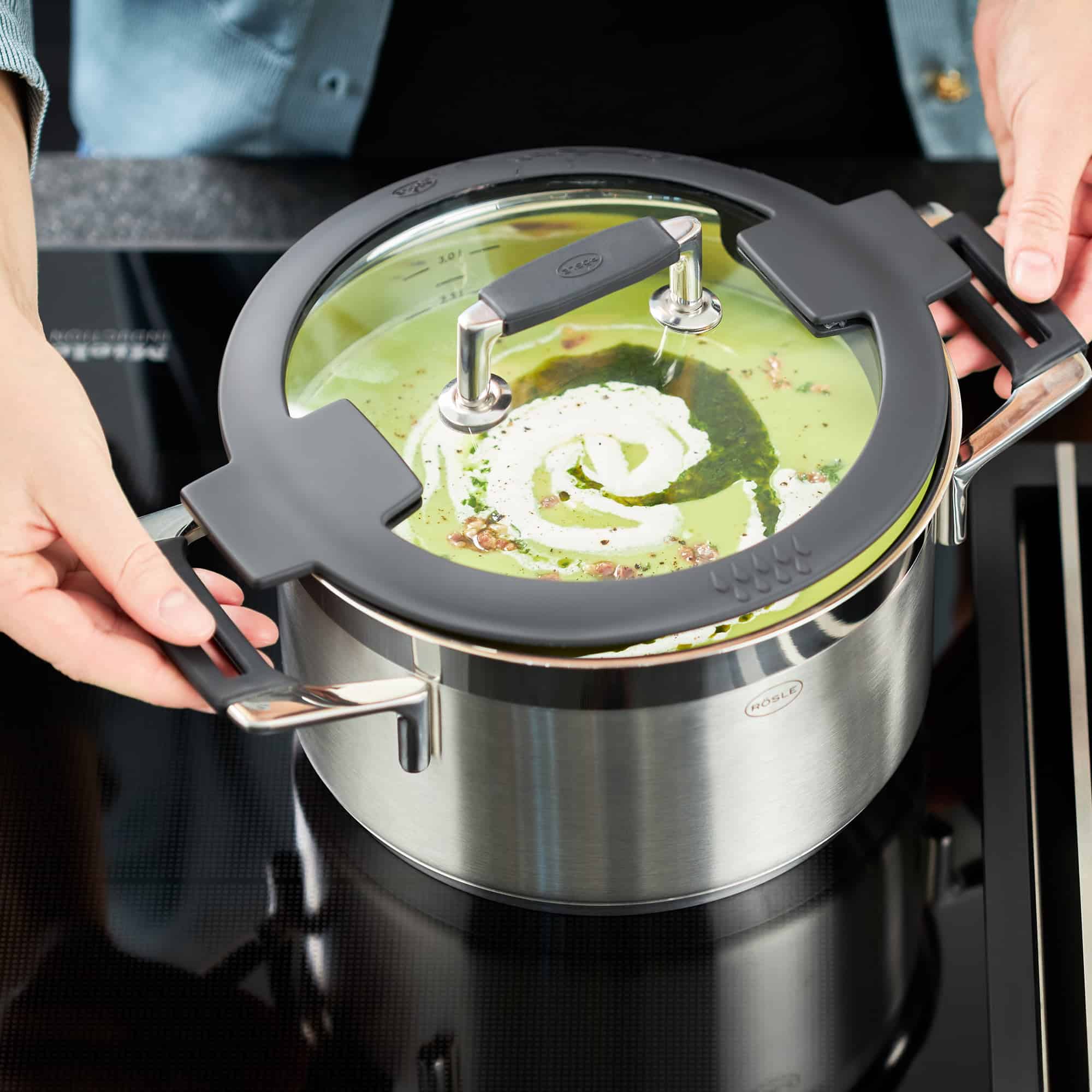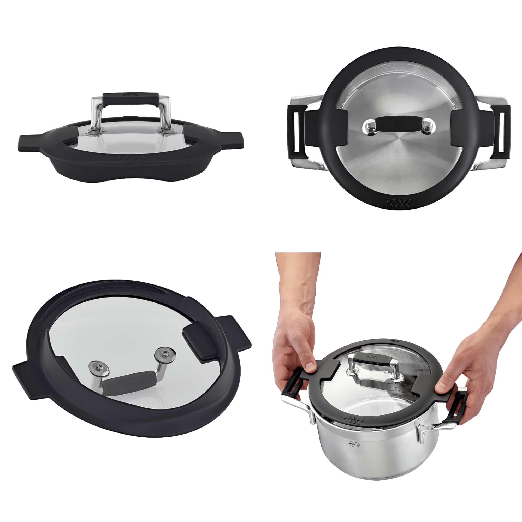 Capacul este piesa care face aceasta oala cu adevarat unica. Acesta poate fi pus pe maner, pentru a salva spatiu, iar condensul rezultat va fi colectat direct in marginea capacului evitand scurgerea pe plita/ aragaz.