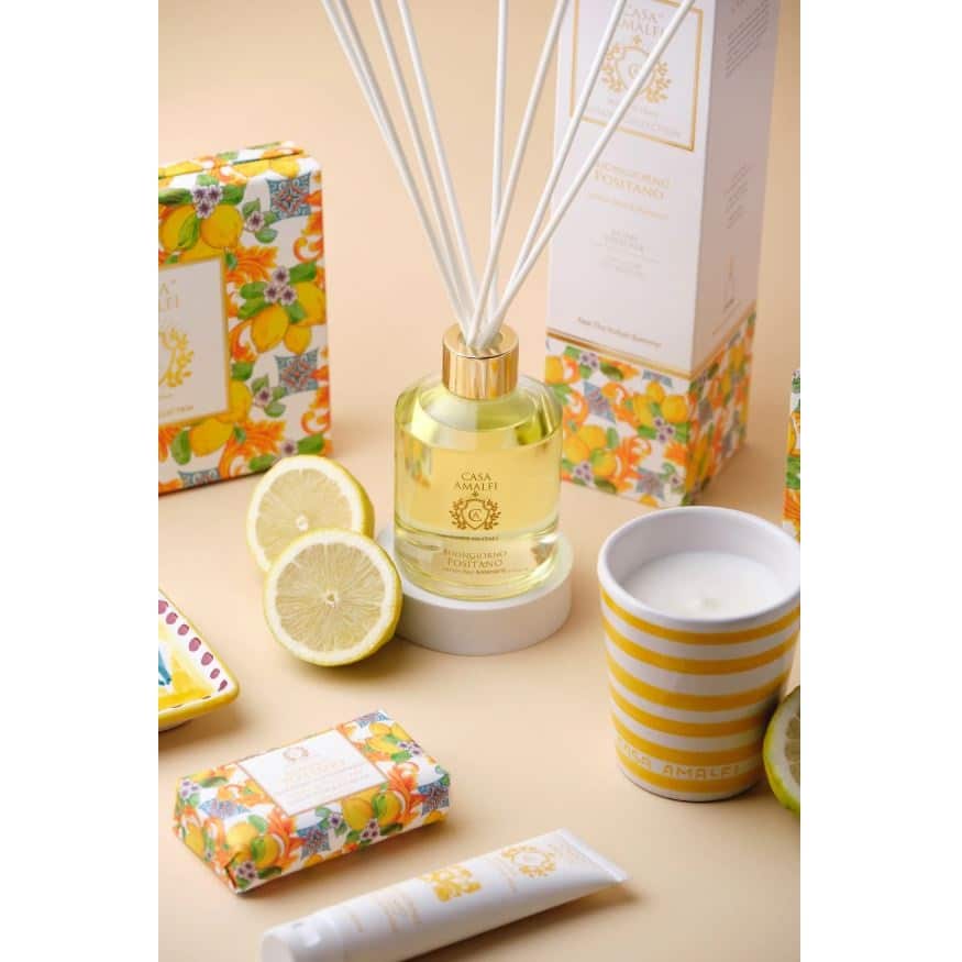 Inunda spatiul cu difuzorul fermecator Buongiorno Positano, o editie limitata inspirata de orasul Positano in zilele de vara. Cufunda-te in parfumul revigorant de lamai proaspete, mandarine aromate si busuioc italian parfumat, creand o atmosfera relaxanta care te va face sa deschizi ferestrele si sa iti incepi ziua intr-o nota boema.