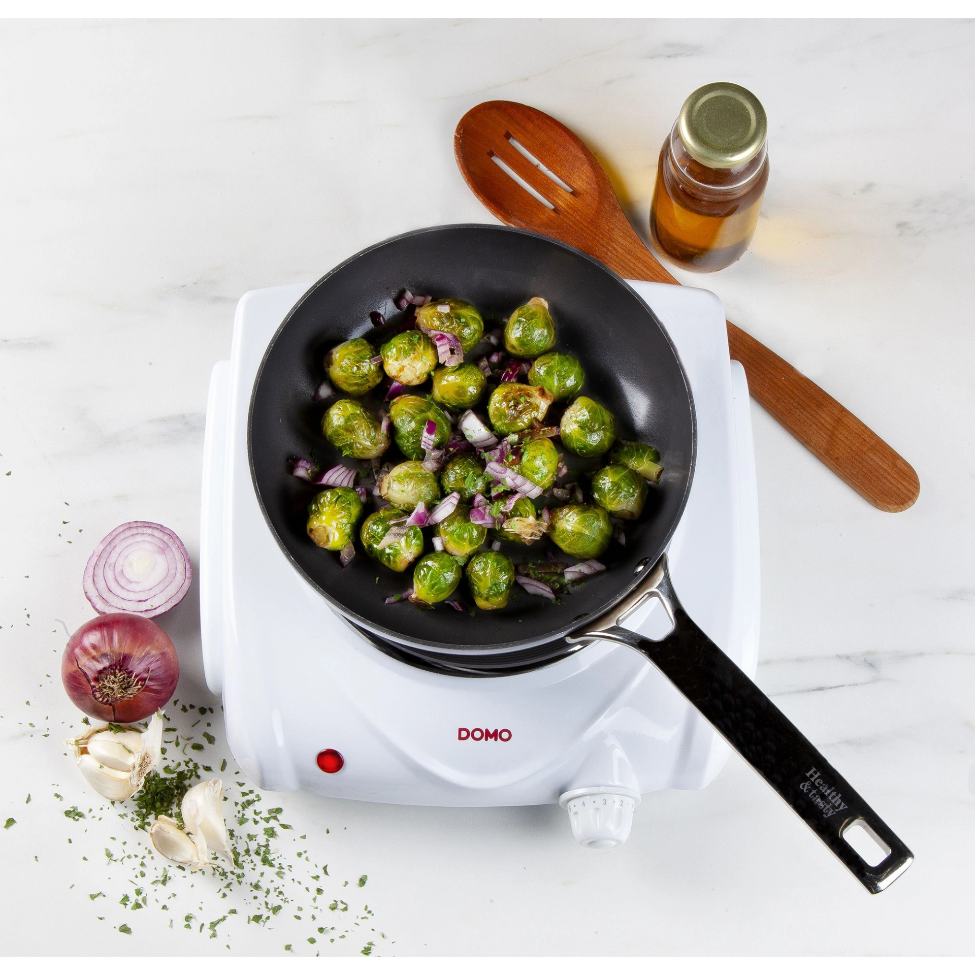 Plita electrica, de la brandul german DOMO, este perfecta pentru bucatarii mici, rulote sau camine de studenti, fiind redusa in dimensiuni si usor de depozitat.