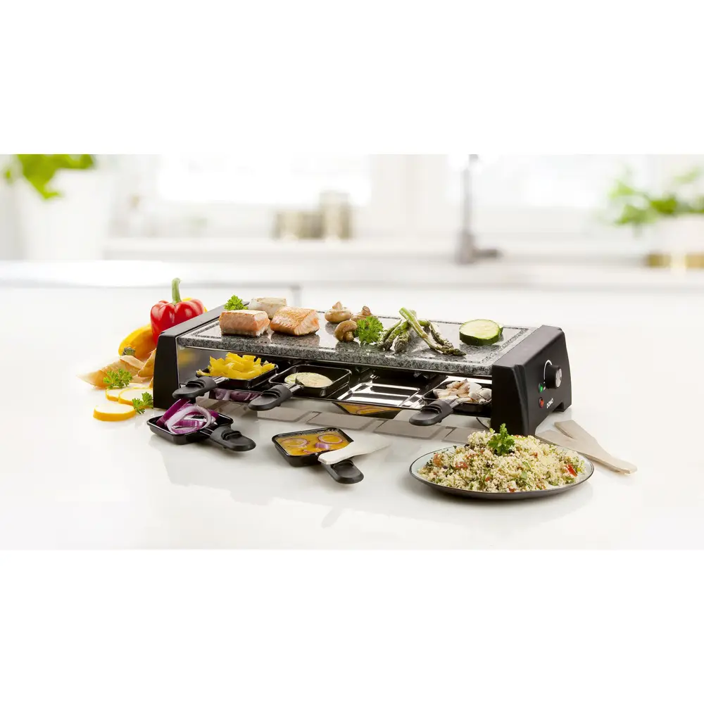 De acum, orice intalnire cu cei dragi se tranforma intr-un adevarat show culinar! Pune-ti abilitatile la incercare si pregateste cele mai delicioase feluri de mancare pe plita grill DOMO. Aparatul dispune de o arie utila mare, perfecta pentru o masa pana la 8 persoane. De asemenea, alaturi de dispozitiv primesti si 8 raclete speciale in care branza topita prinde un alt gust, dar si 8 linguri perfecte pentru a savura mancarea.