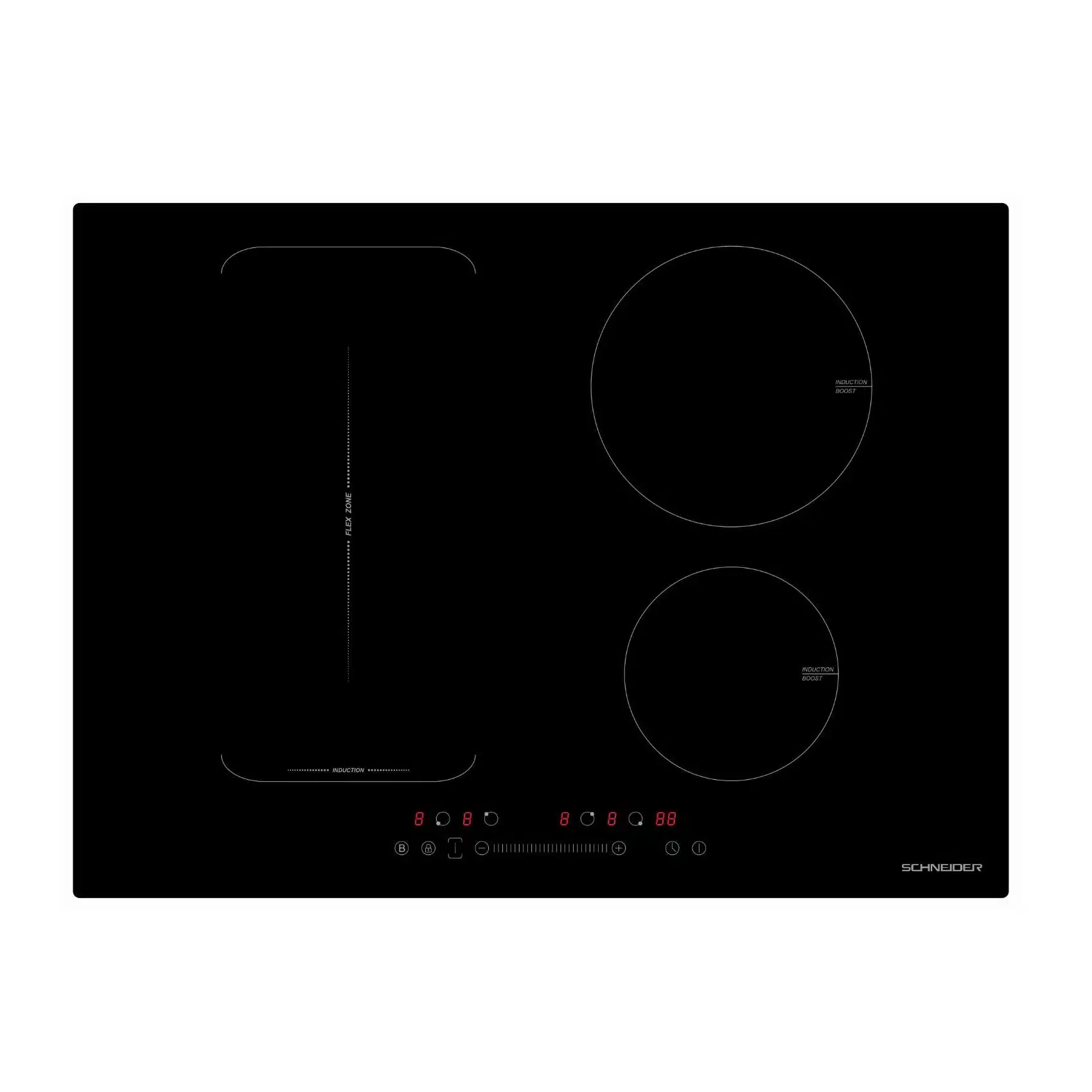 Plita electrica cu inductie de la brandul francez Schneider, cu 4 arzatoare, este ideala pentru o bucatarie moderna, potrivindu-se oriunde, datorita designului elegant din sticla neagra.