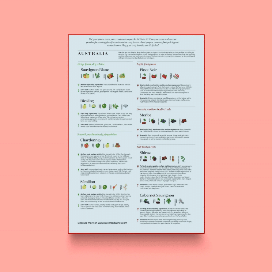 Profilurile strugurilor si sfaturile de asociere cu alimentele sunt incluse in cutia puzzle-ului, ceea ce il face o experienta completa de invatare a vinului. Mai mult decat un puzzle, acesta este o sarbatoare a vinurilor australiene si a faunei salbatice superbe, conceput pentru a oferi ore intregi de divertisment.