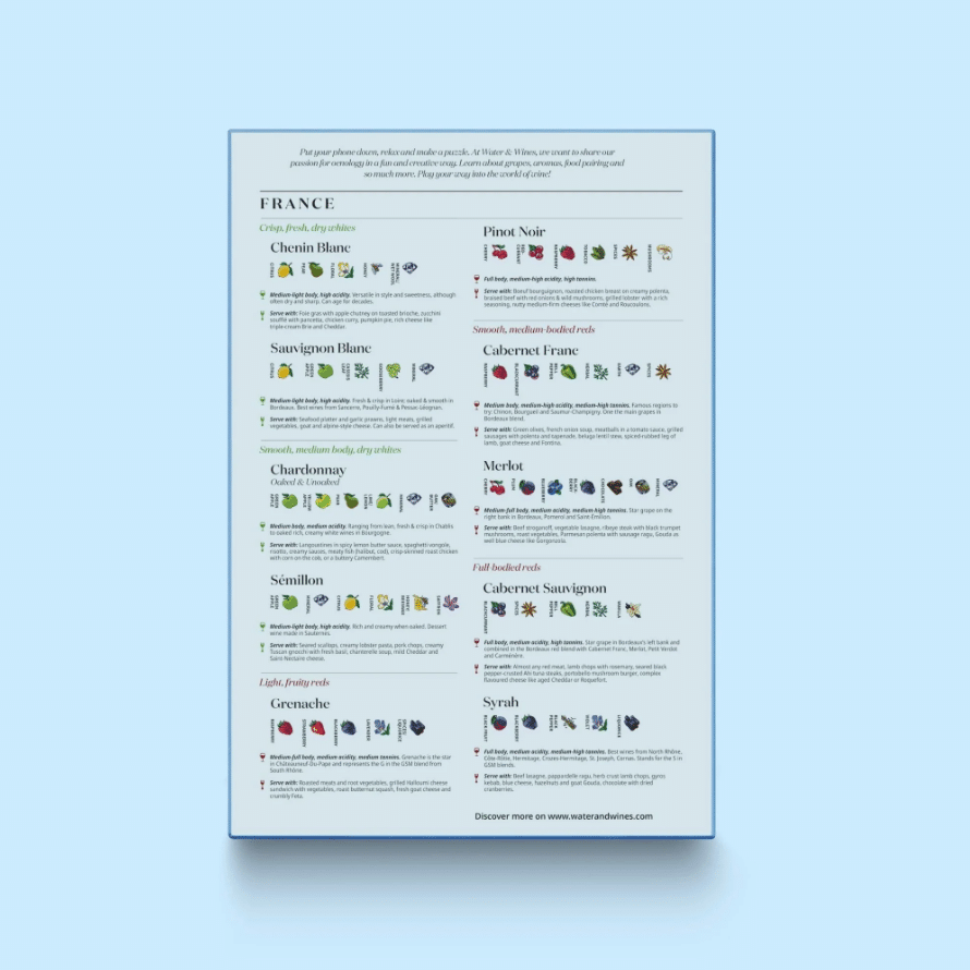 Calatoriti prin potgoriile din Franta, in fiecare regiune, cu acest puzzle frumos desenat manual. Descoperiti strugurii si denumirile vedeta ale regiunilor emblematice care au facut din Franta una dintre cele mai faimoase tari viticole din lume. Creata de catre somelieri, cutia de puzzle prezinta profile ale strugurilor care descriu aromele distincte, caracteristicile cheie si sfaturile de combinare a alimentelor din fiecare regiune.