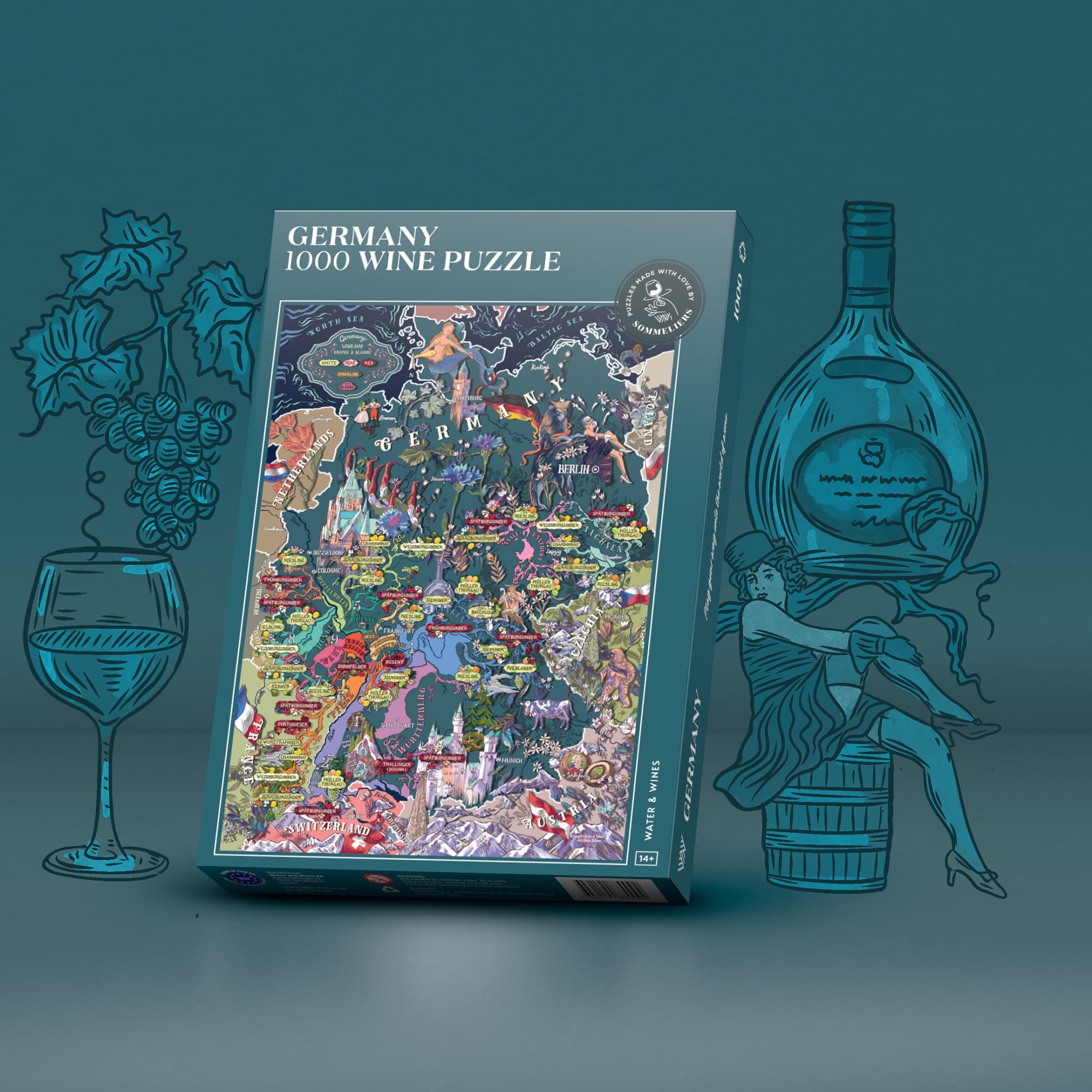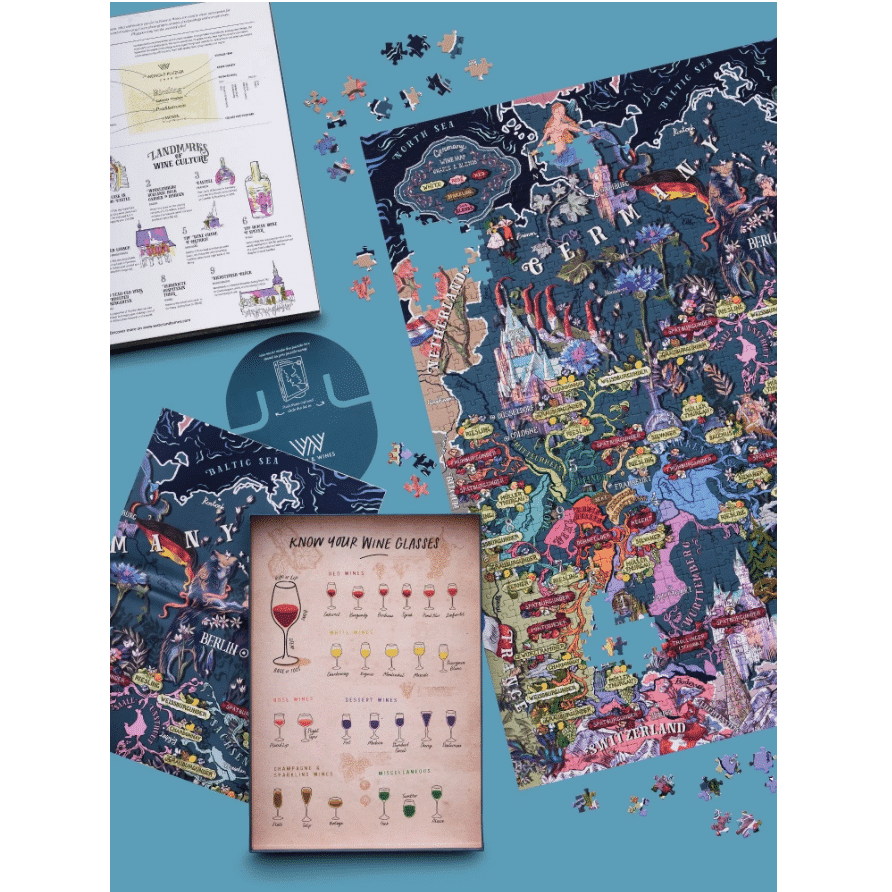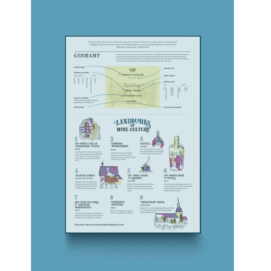 Pe langa designul complex al puzzle-ului, cutia contine si informatii despre tipurile de struguri, un ghid pentru etichetele vinurilor germane si punctele de reper ale culturii vinului din Germania. Pe masura ce asamblati puzzle-ul, explorati harta si descoperiti diferitele regiuni si locuri viticole care fac din aceasta tara o destinatie unica si diversa pentru vinuri.