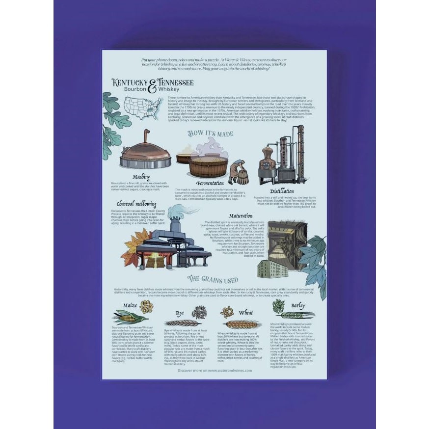 Paseste in lumea whisky-ului bourbon cu puzzle-ul Kentucky&Tennessee, de la brandul Water and Wines, conceput de specialisti si ilustrat de artisti. Pe masura ce alcatuiti harta complexa, descoperiti distilerii locale si calatoriti prin istoria SUA. Fiecare piesa de puzzle dezvaluie povestea acestui elixir de aur, transportandu-va in inima culturii sudice.