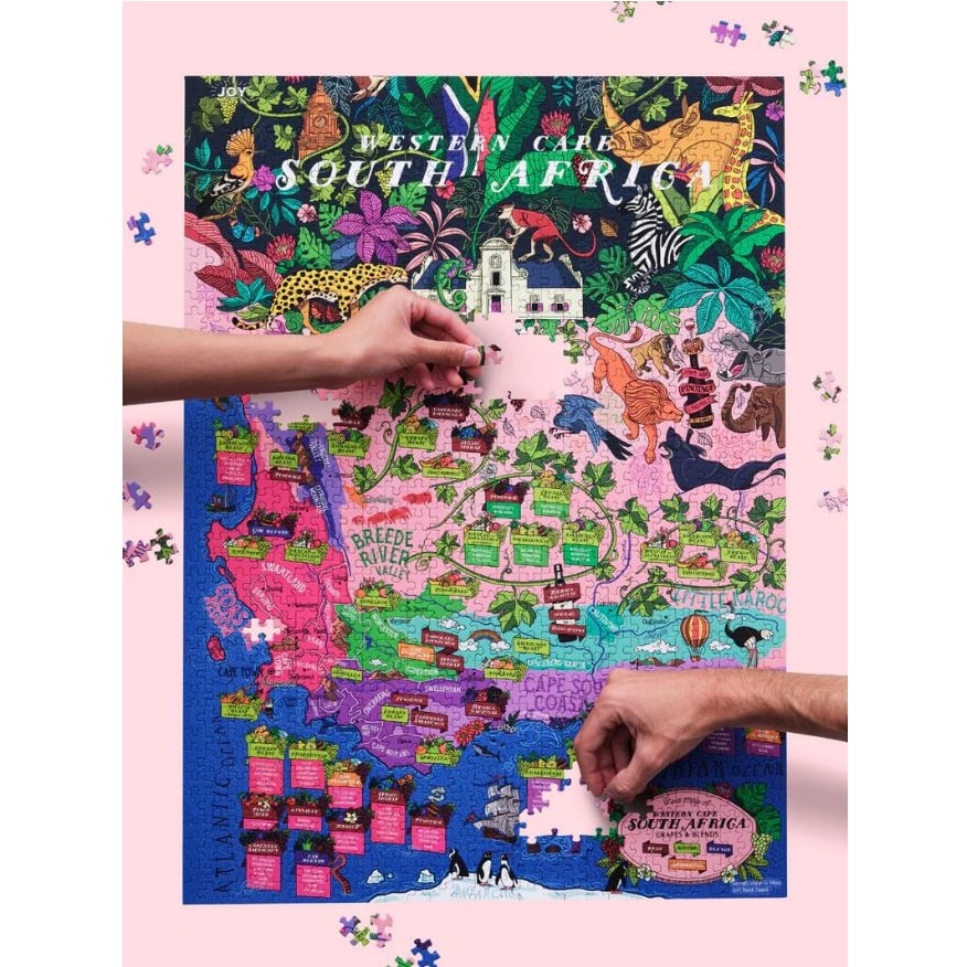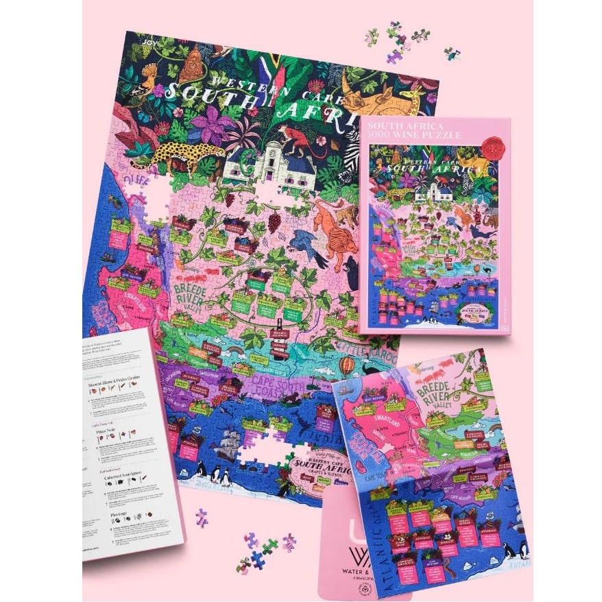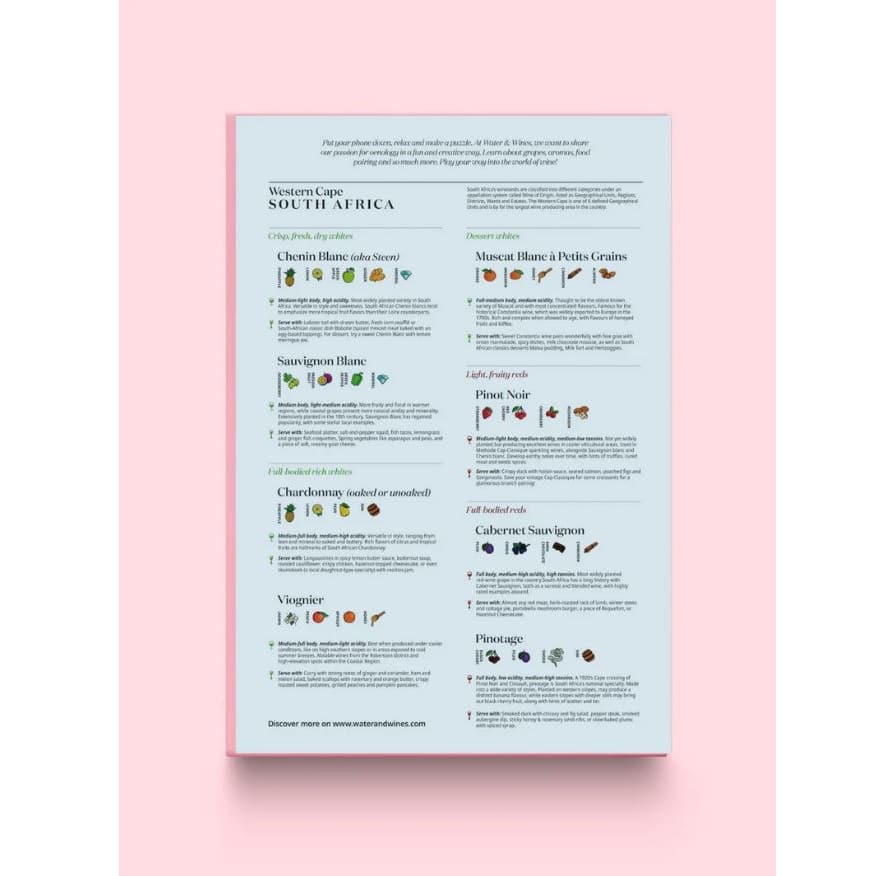 Cufundati-va intr-o feerie a vinurilor din Africa de Sud cu puzzle-ul de la Water and Wines, ilustrat de artisti. De la farmecul coastei Golfului Walker pana la terenul muntos din Stellenbosch, acest puzzle surprinde esenta Western Cape, unde sunt concentrate regiunile cheie producatoare de vin ale tarii.