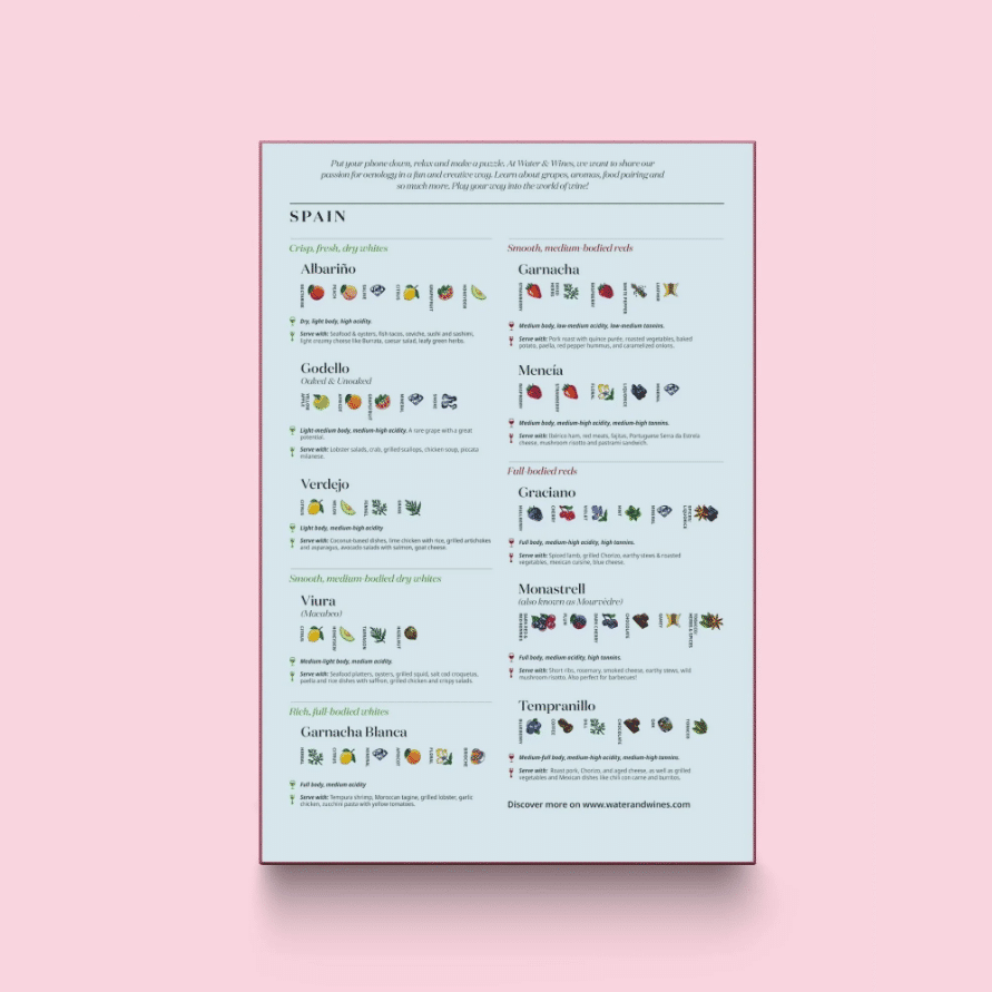 Creata de somelieri cu experienta, cutia ofera profile ale unora dintre cele mai emblematice soiuri de struguri spanioli, detaliind aromele, caracteristicile cheie si sfaturi de asociere cu alimente. Cufundati-va in lumea plina de culoare a vinurilor spaniole in timp ce asamblati acest puzzle feeric, de la vinul alb aspru al Galiciei pana la vinul rosu vulcanic din Insulele Canare.