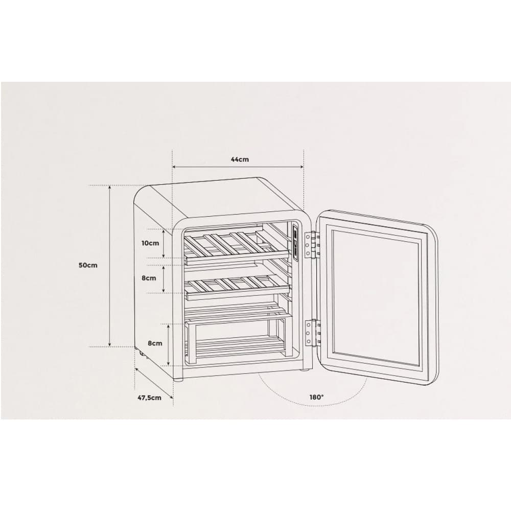 Racitorul are un volum de 48 litri, ceea ce permite depozitarea a 12-15 sticle, in functie de dimensiuni. De asemenea, cele 2 rafturi din lemn si raftul de prezentare sunt detasabile si interschimbabile oferind mai mult spatiu atunci cand este necesar.