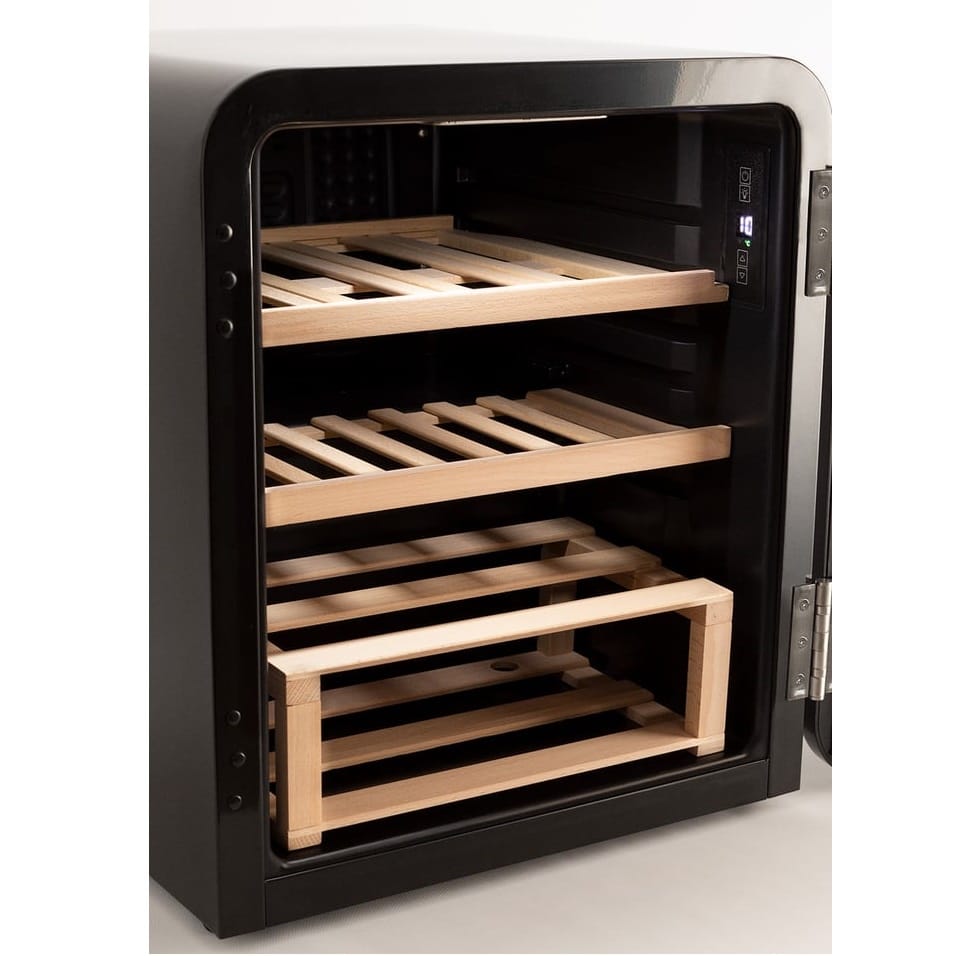 Racitorul are un volum de 48 litri, ceea ce permite depozitarea a 12-15 sticle, in functie de dimensiuni. De asemenea, cele 2 rafturi din lemn si raftul de prezentare sunt detasabile si interschimbabile oferind mai mult spatiu atunci cand este necesar.