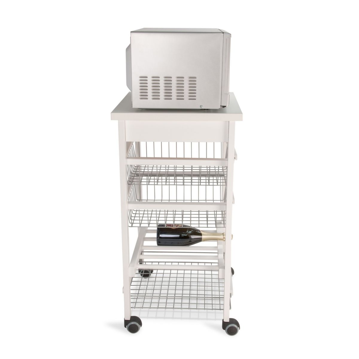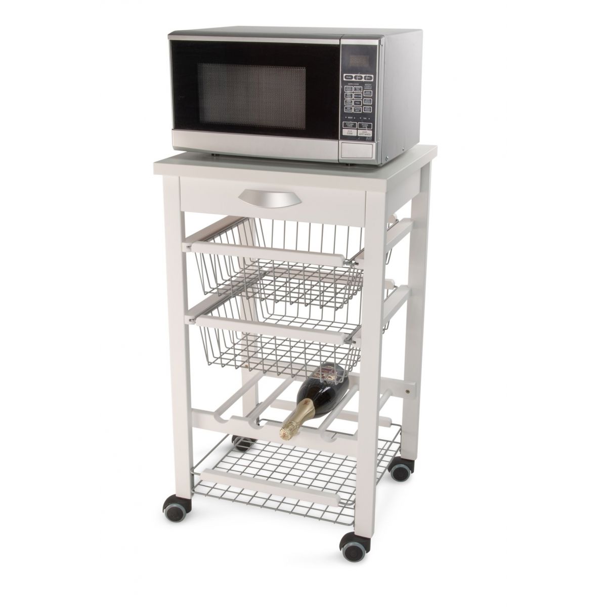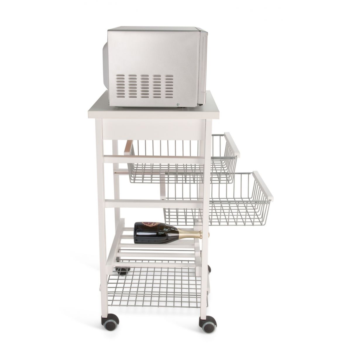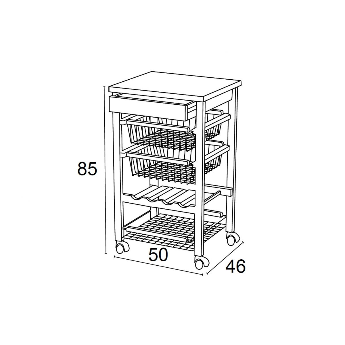 Avand o structura din lemn masiv de fag, raftul mobil este destinat utilizarii zilnice. Dispune de un sertar, 2 cosuri glisante pentru fructe sau legume si un raft destinat sticlelor.