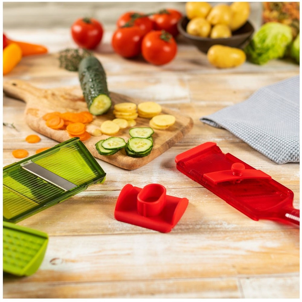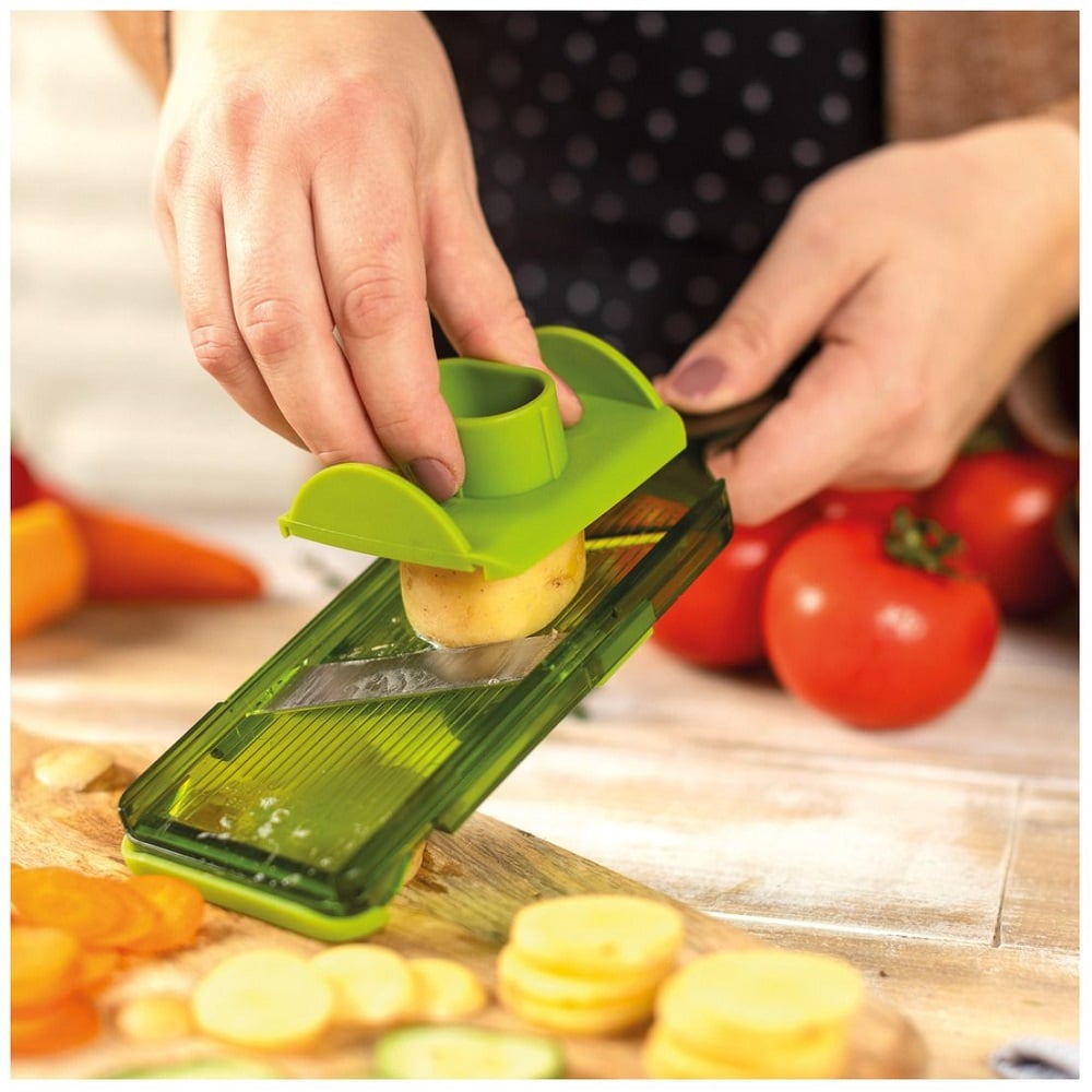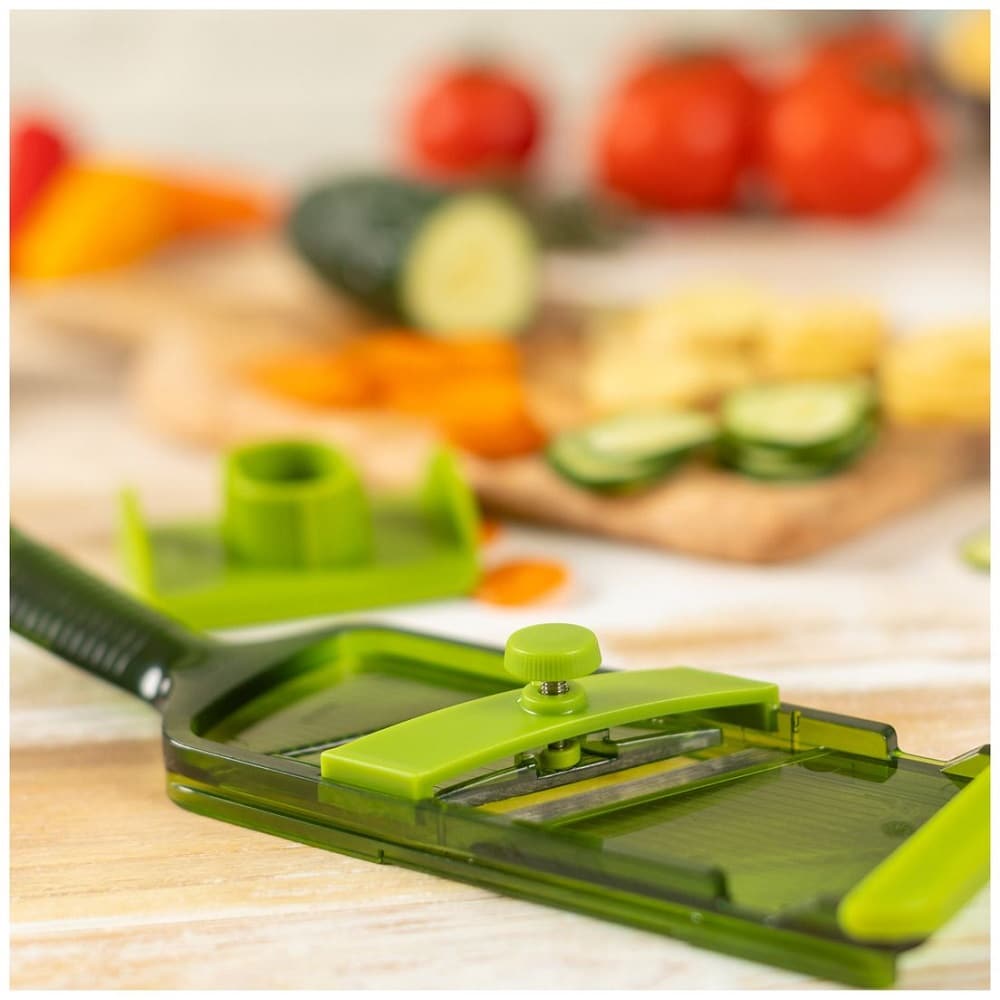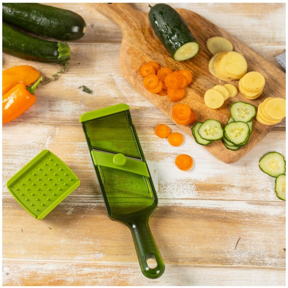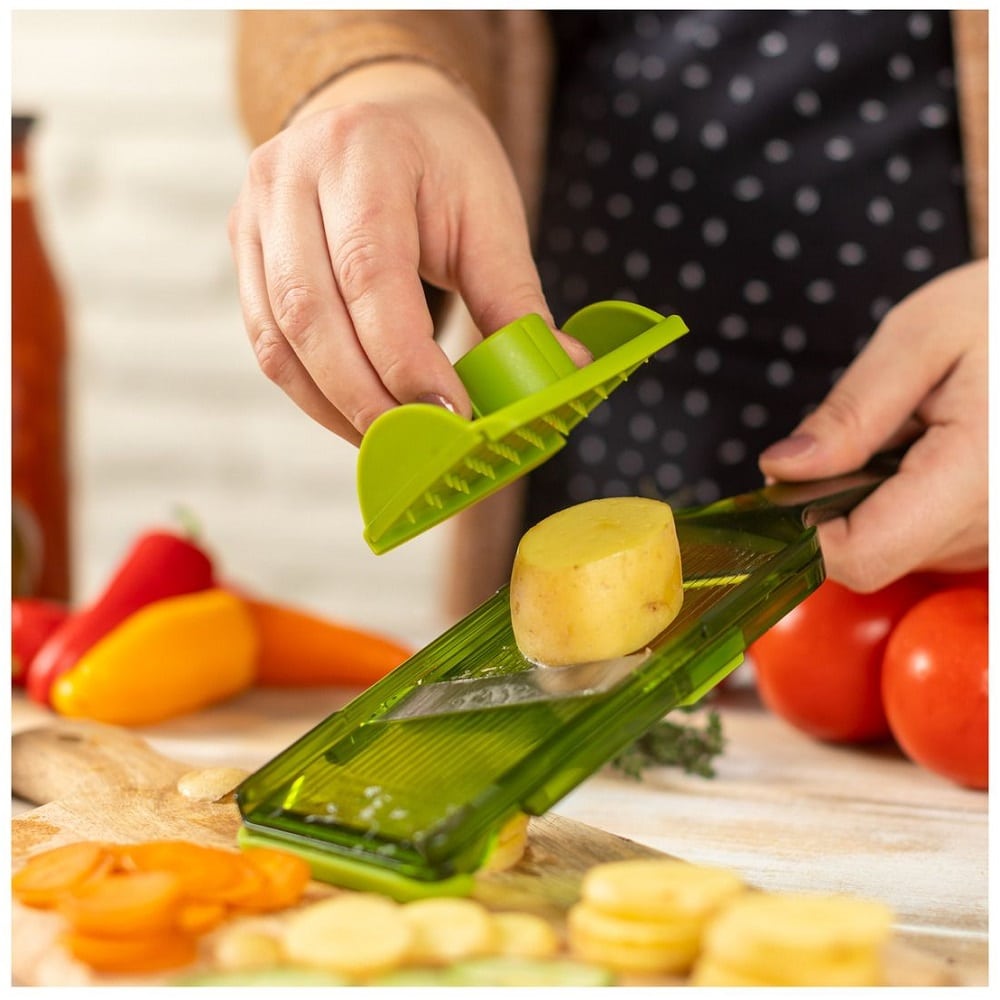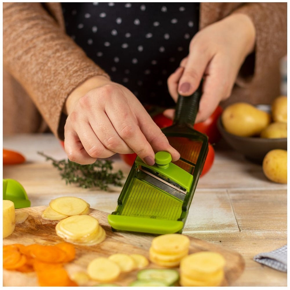 Lama extra ascutita din otel inoxidabil poate fi reglata pana la 3.5 mm. Feliatorul vine impreuna cu o protectie pentru maini, pentru a-ti proteja degetele in timpul procesului.