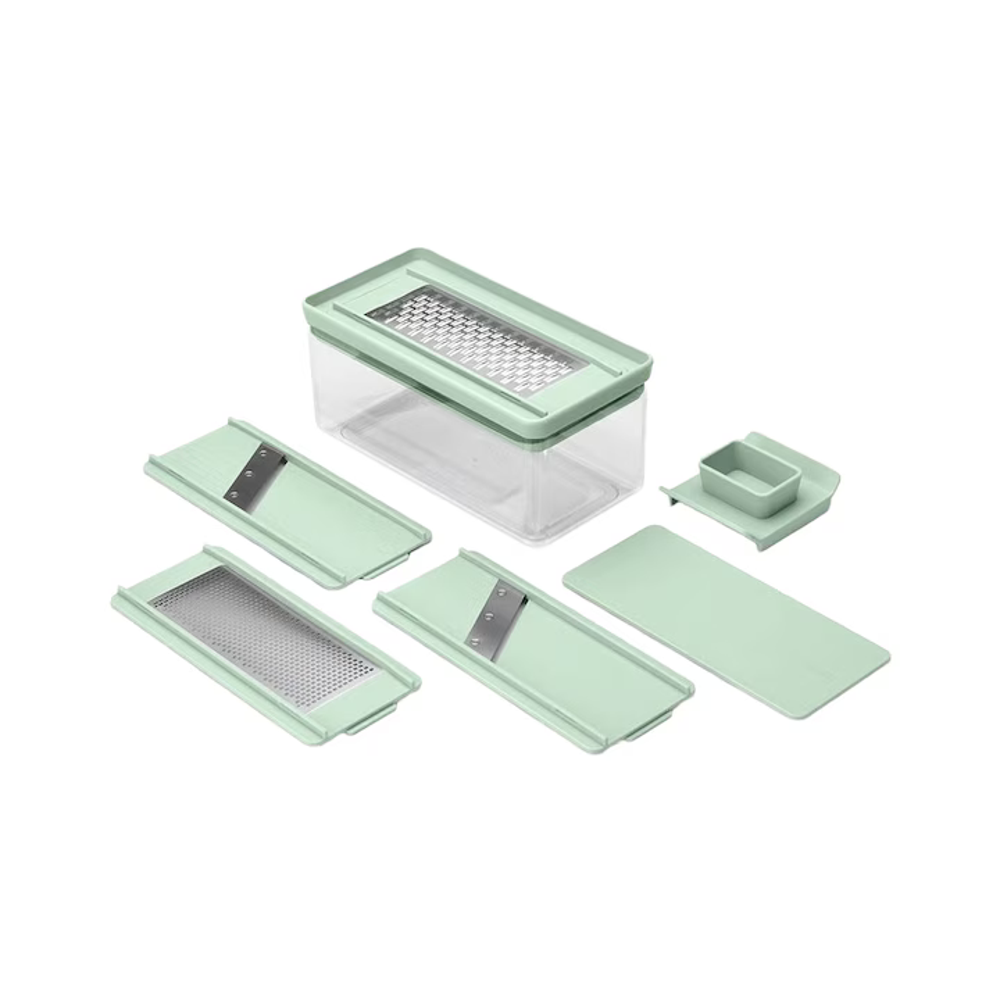 Pur si simplu alege lama potrivita, iar continutul va ajunge in recipient, simplu si fara dezordine! Multumita suportului pentru degete, poti felia si rade branza sau legumele mai mici in totalitate! Poti depozita lamele in recipient, astfel totul este compact si usor de organizat.