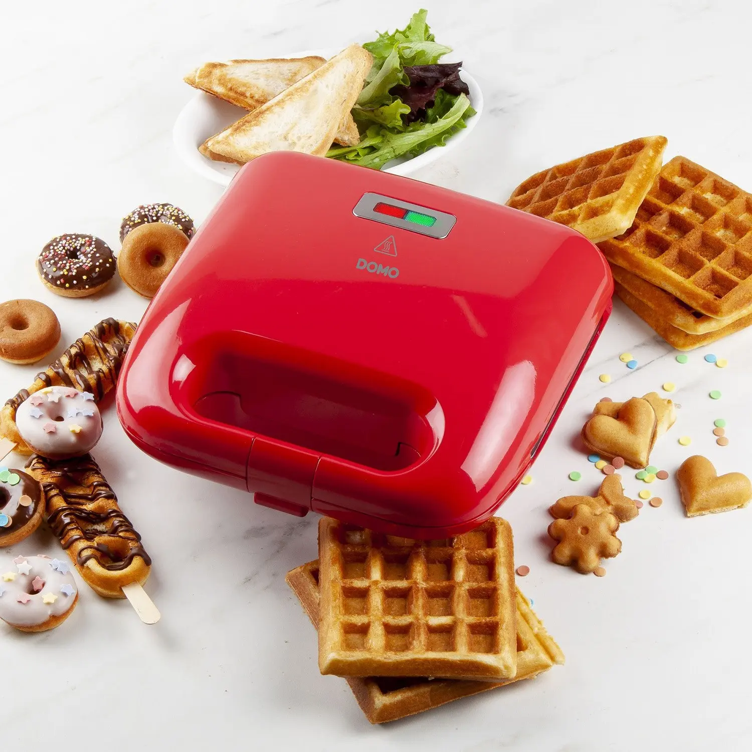 Snack Party 5in1 de la brandul belgian DOMO, este un sandwich maker si aparat de preparat desert, perfect pentru un mic dejun sau gustare rapida, fie ea dulce sau sarata. Placile de coacere antiaderente nu permite alimentelor sa se lipeasca si sunt usor de curatat.