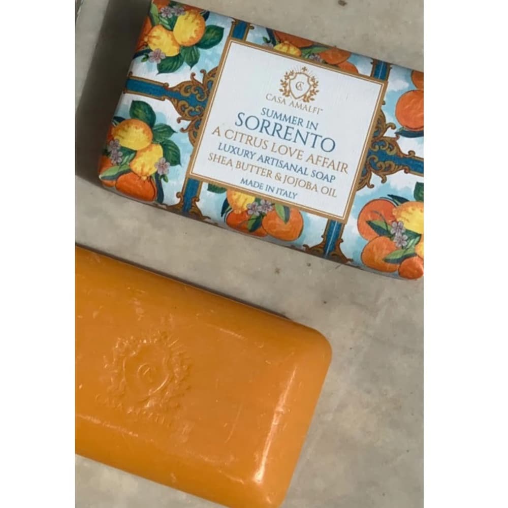 Sapunul artizanal Summer in Sorrento, de la brandul italian Casa Amalfi, este inspirat de zilele lungi ale verii, de plaja si de saruturi la ceas de seara. Un amestec luxuriant de citrice si mirodenii, acest sapun este plin de antioxidanti, lasand pielea radianta. Sapunul este realizat de artizani in Italia, totul intr-un ambalaj elegant, in stilul maiolica.